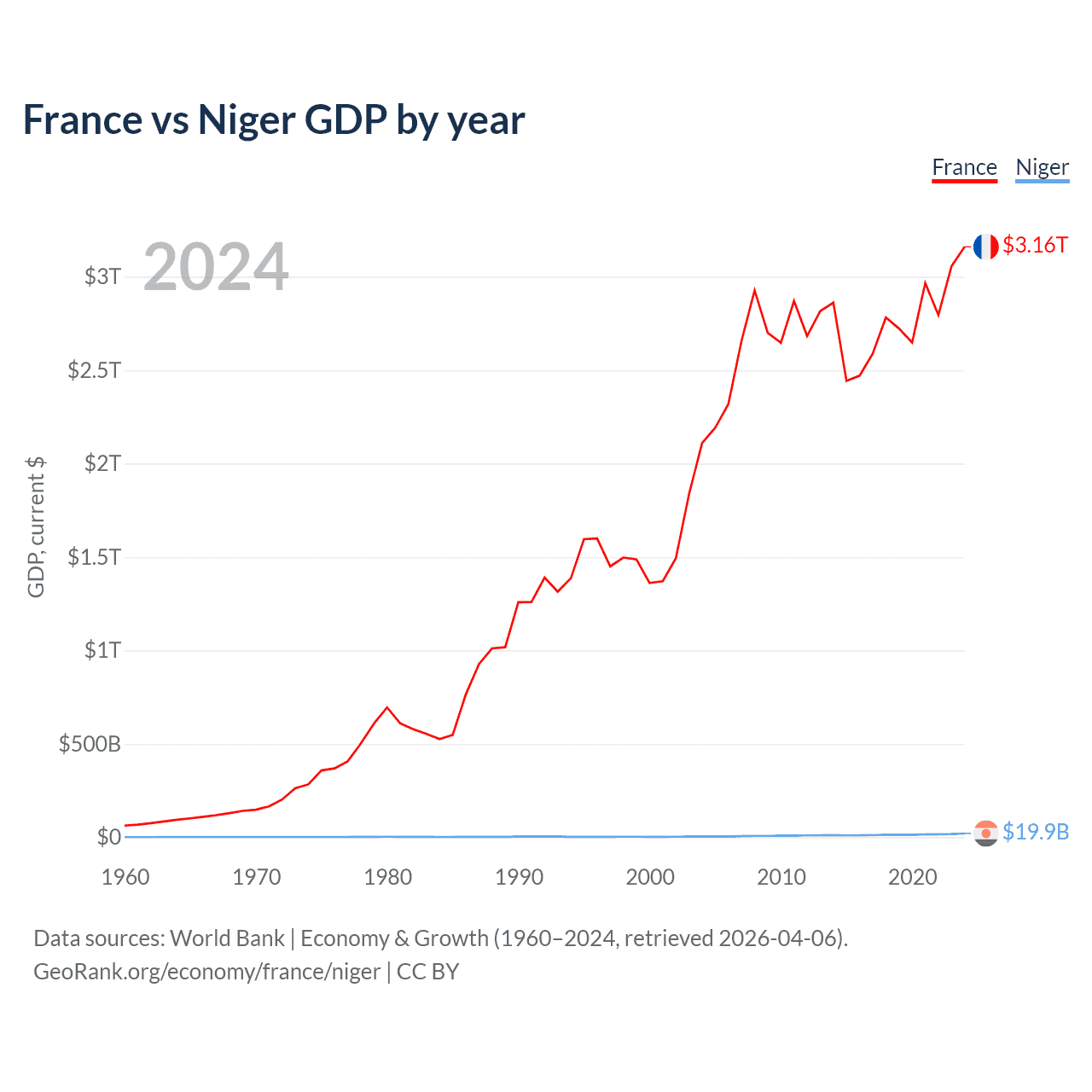France has a GDP of $3.16T compared to $19.9B for Niger, ranking 7/197 and 130/197 by economy size, respectively.