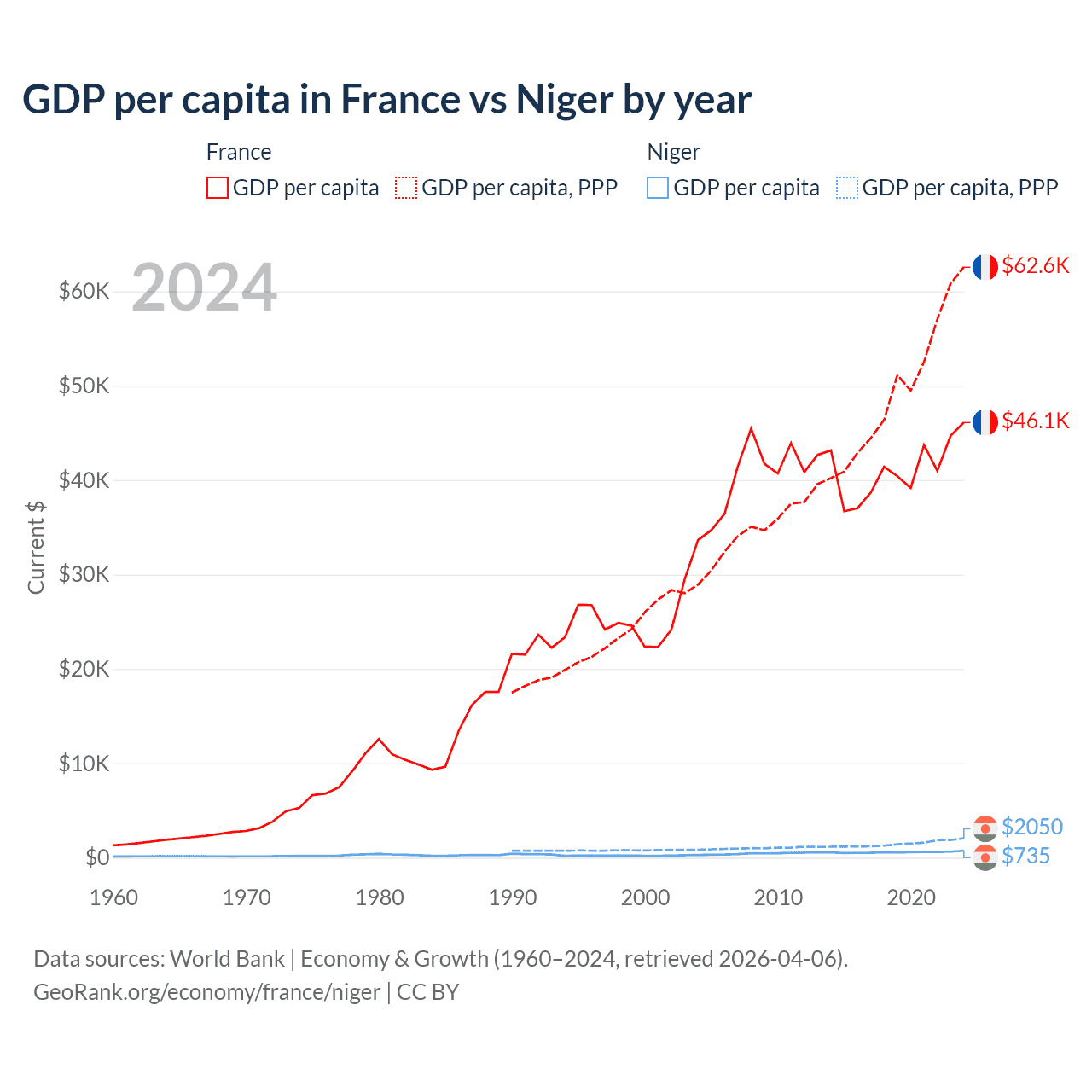 GDP per capita in France vs Niger by year