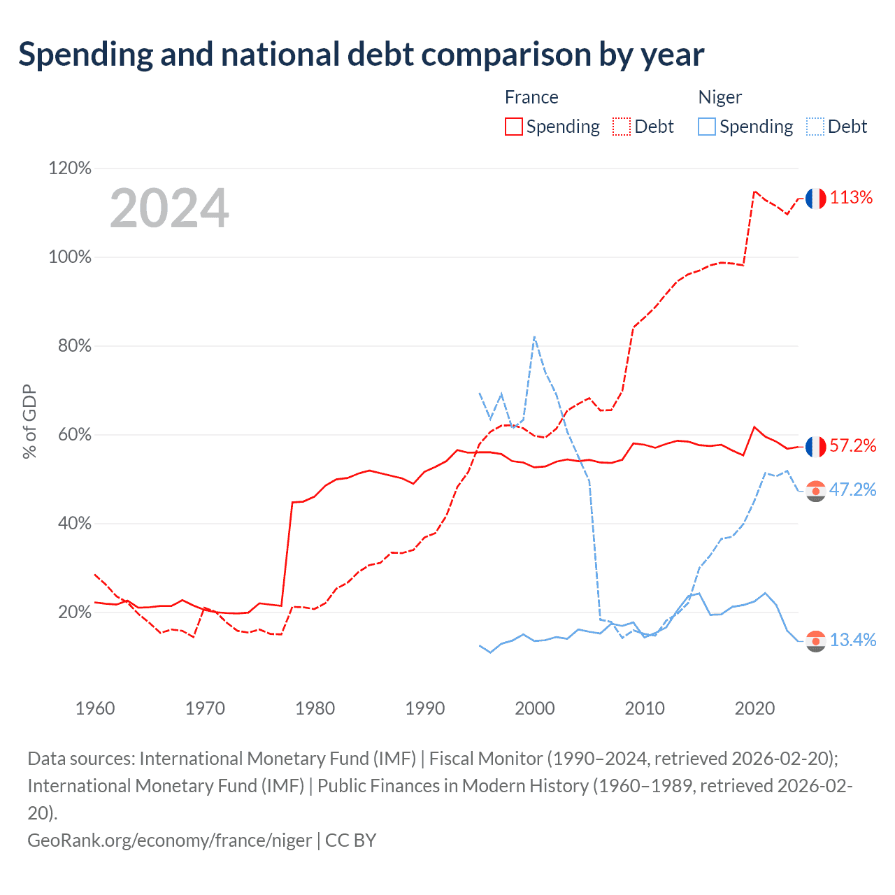 France has $3.58T in government debt (113.1% of GDP), compared to $9.39B (47.2% of GDP) in Niger.