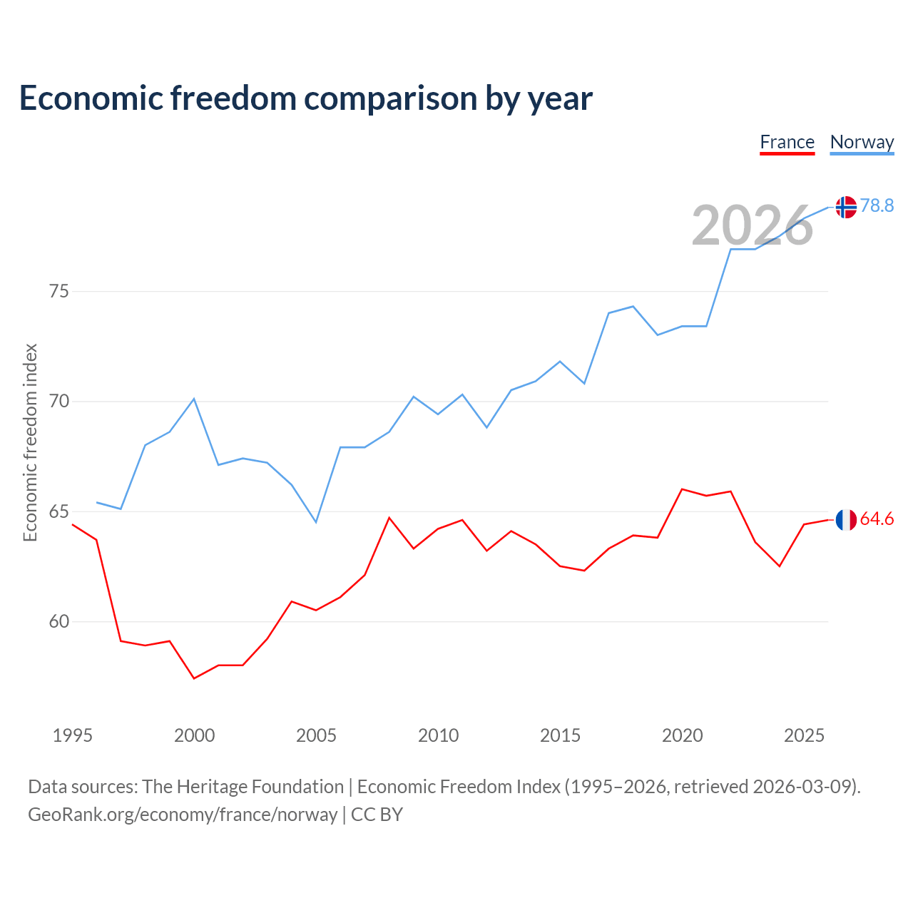 The Economic Freedom Index for France is 64.6, ranking 72/197, compared to 78.8 for Norway, ranking 9/197. The chart above displays a comparison of annual changes in economic freedom indexes.