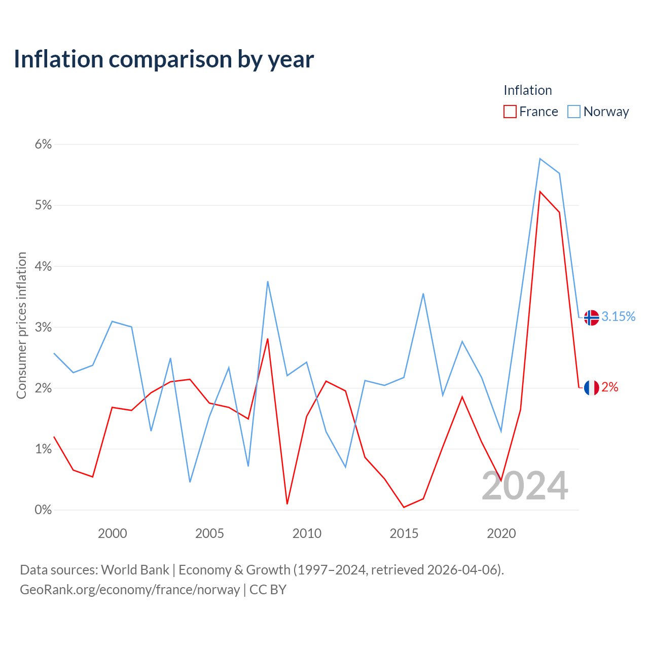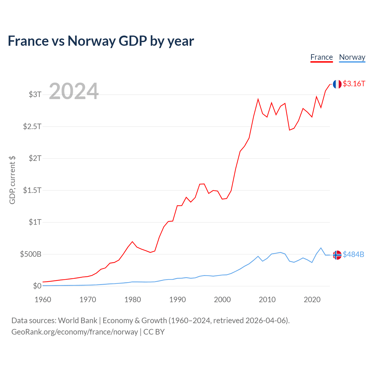 France has a GDP of $3.16T compared to $484B for Norway, ranking 7/197 and 32/197 by economy size, respectively.