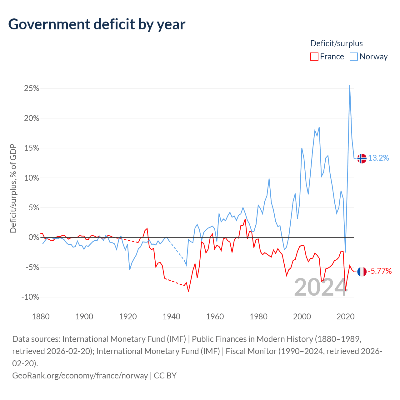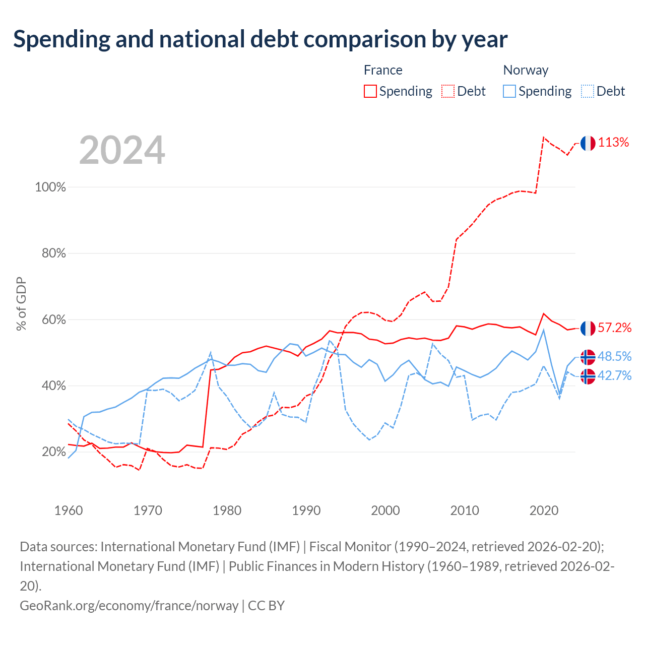 France has $3.58T in government debt (113.1% of GDP), compared to $207B (42.7% of GDP) in Norway.