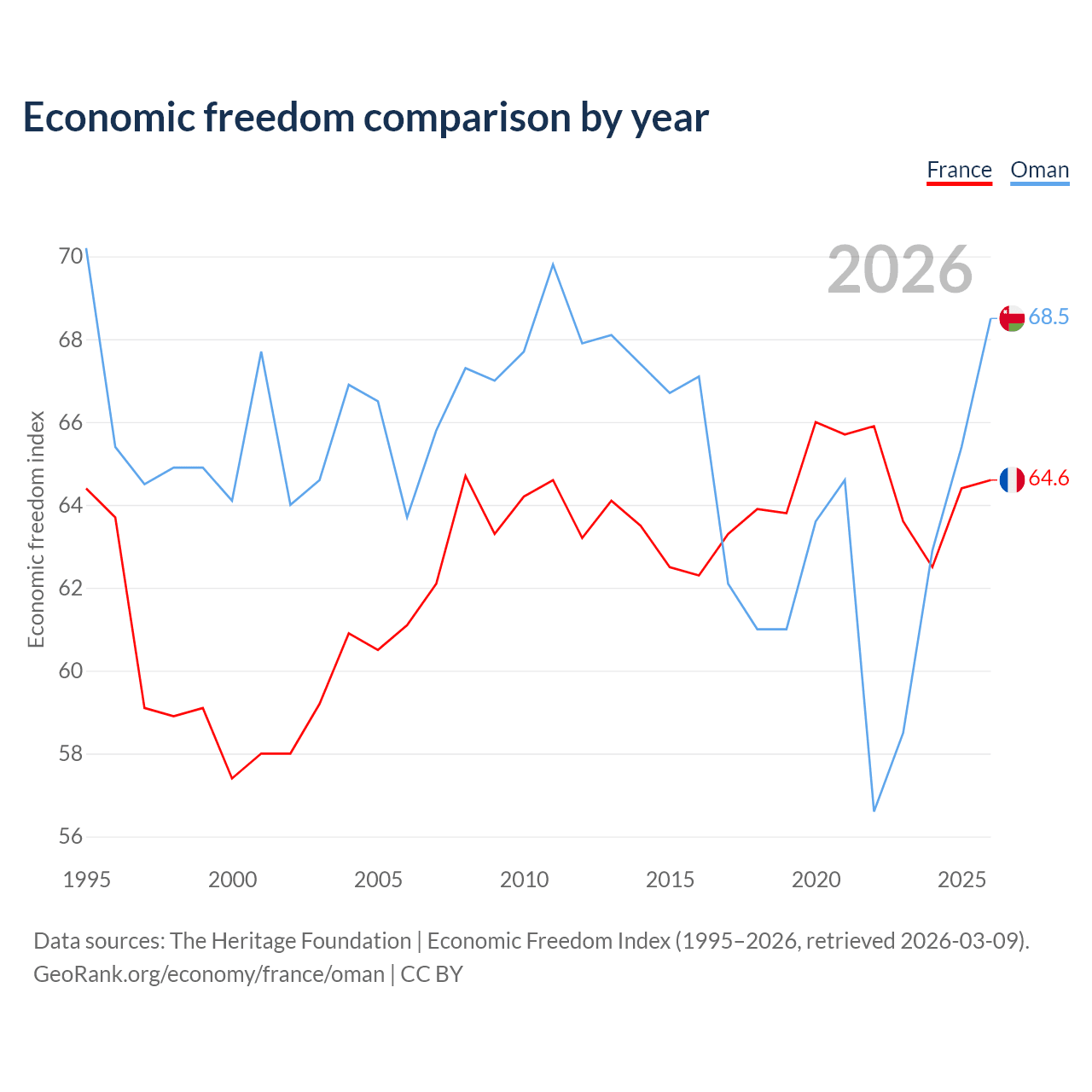 The Economic Freedom Index for France is 64.6, ranking 72/197, compared to 68.5 for Oman, ranking 45/197. The chart above displays a comparison of annual changes in economic freedom indexes.