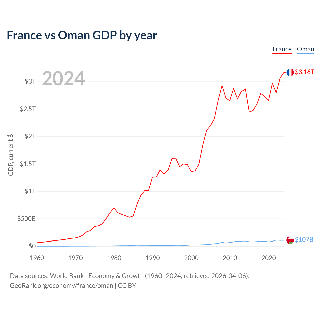 France has a GDP of $3.16T compared to $107B for Oman, ranking 7/197 and 70/197 by economy size, respectively.