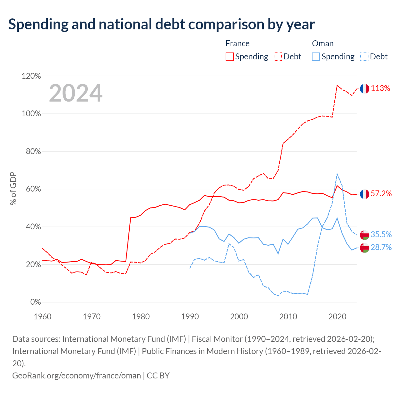 France has $3.58T in government debt (113.1% of GDP), compared to $38B (35.5% of GDP) in Oman.