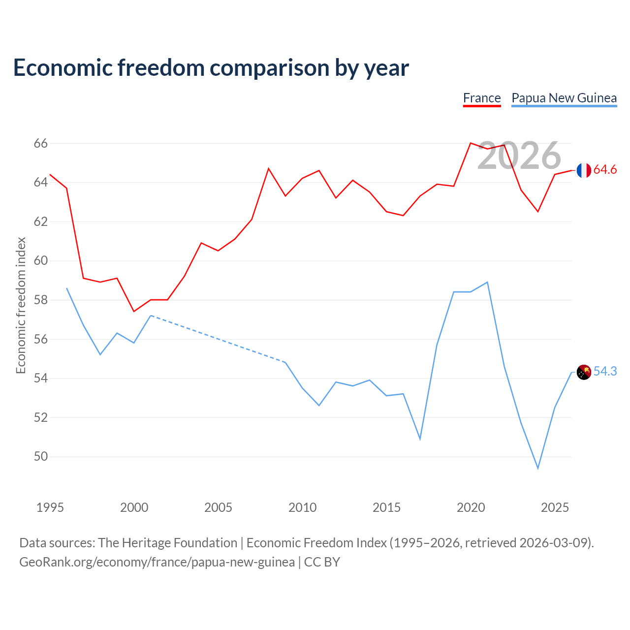The Economic Freedom Index for France is 64.6, ranking 72/197, compared to 54.3 for Papua New Guinea, ranking 134/197. The chart above displays a comparison of annual changes in economic freedom indexes.