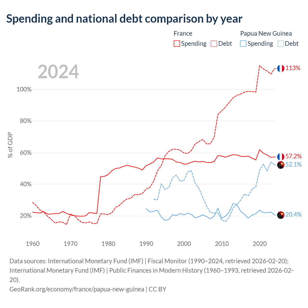 France has $3.58T in government debt (113.1% of GDP), compared to $16.6B (52.1% of GDP) in Papua New Guinea.