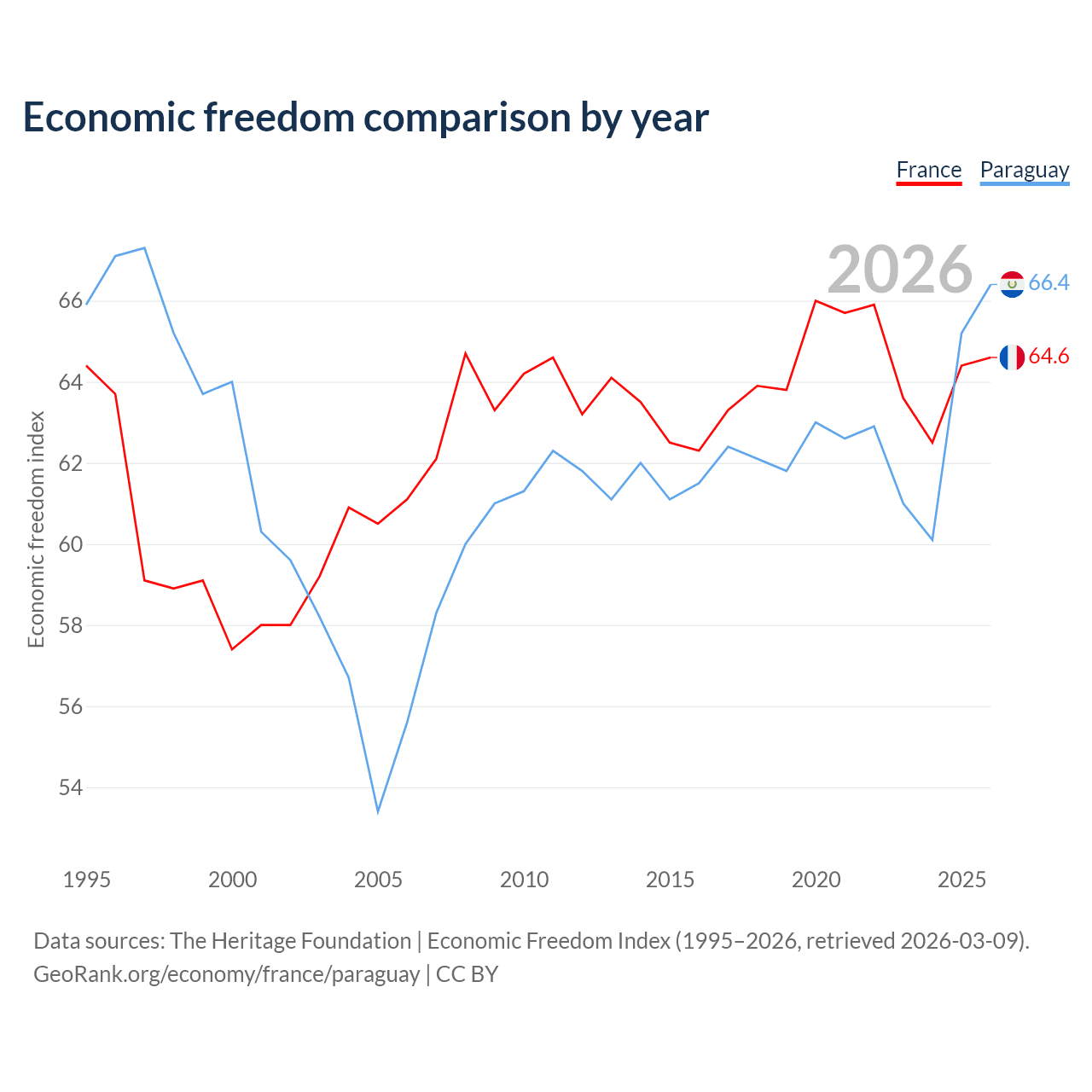 Data sources: The Heritage Foundation | Economic Freedom Index (1995–2026, retrieved 2026-03-09).