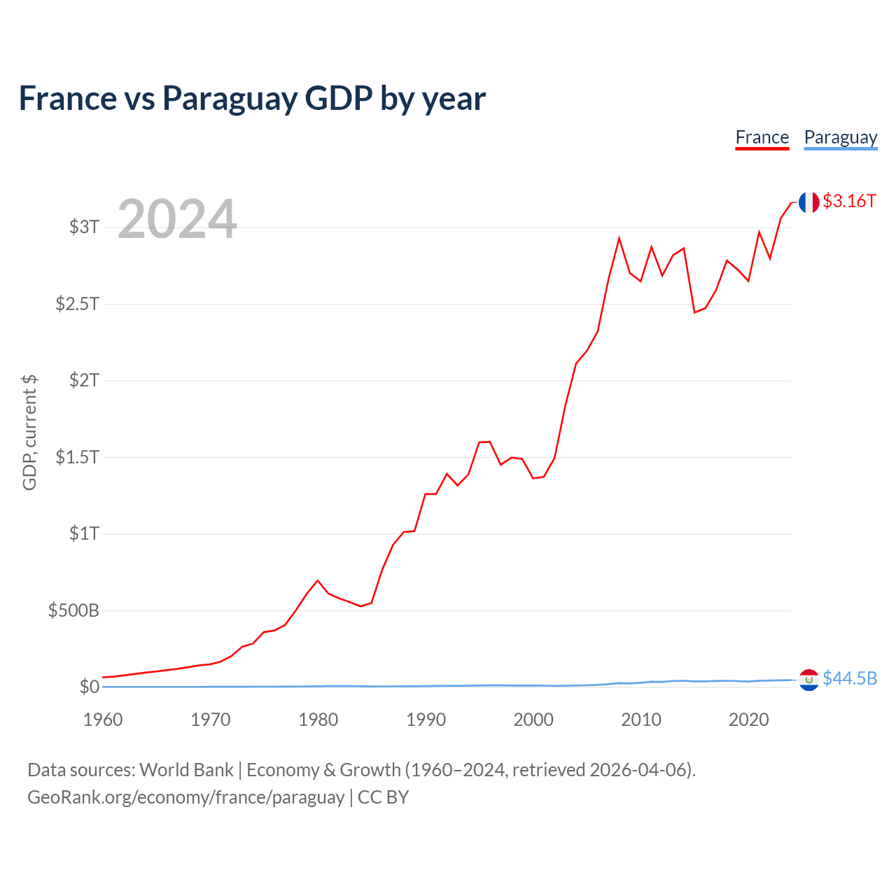 France has a GDP of $3.16T compared to $44.5B for Paraguay, ranking 7/197 and 98/197 by economy size, respectively.