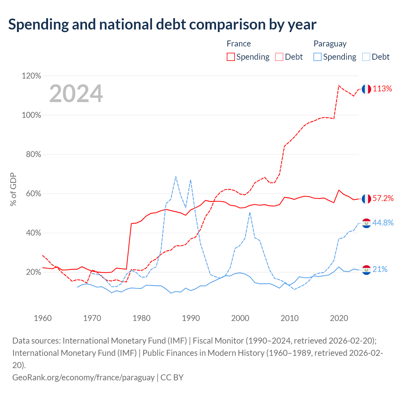 France has $3.58T in government debt (113.1% of GDP), compared to $19.9B (44.8% of GDP) in Paraguay.