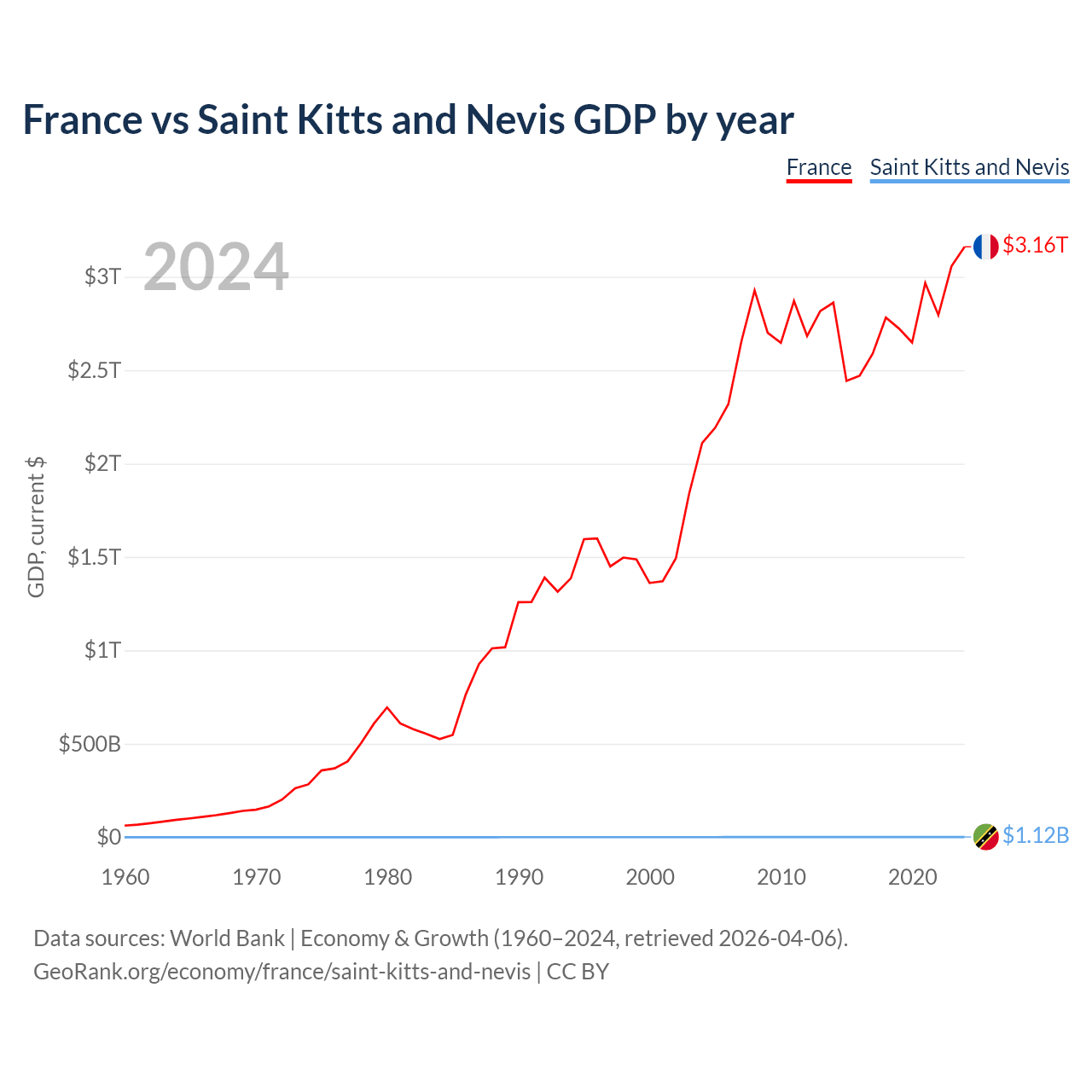 France has a GDP of $3.16T compared to $1.12B for Saint Kitts and Nevis, ranking 7/197 and 187/197 by economy size, respectively.