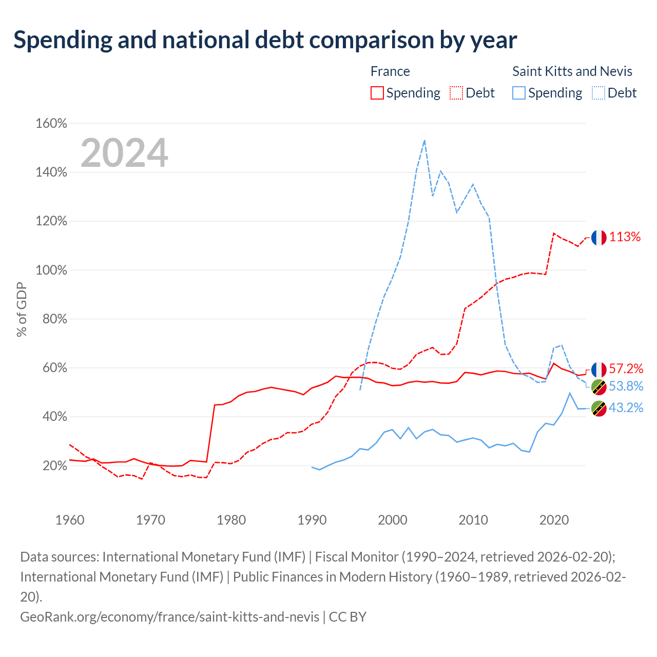 France has $3.58T in government debt (113.1% of GDP), compared to $604M (53.8% of GDP) in Saint Kitts and Nevis.