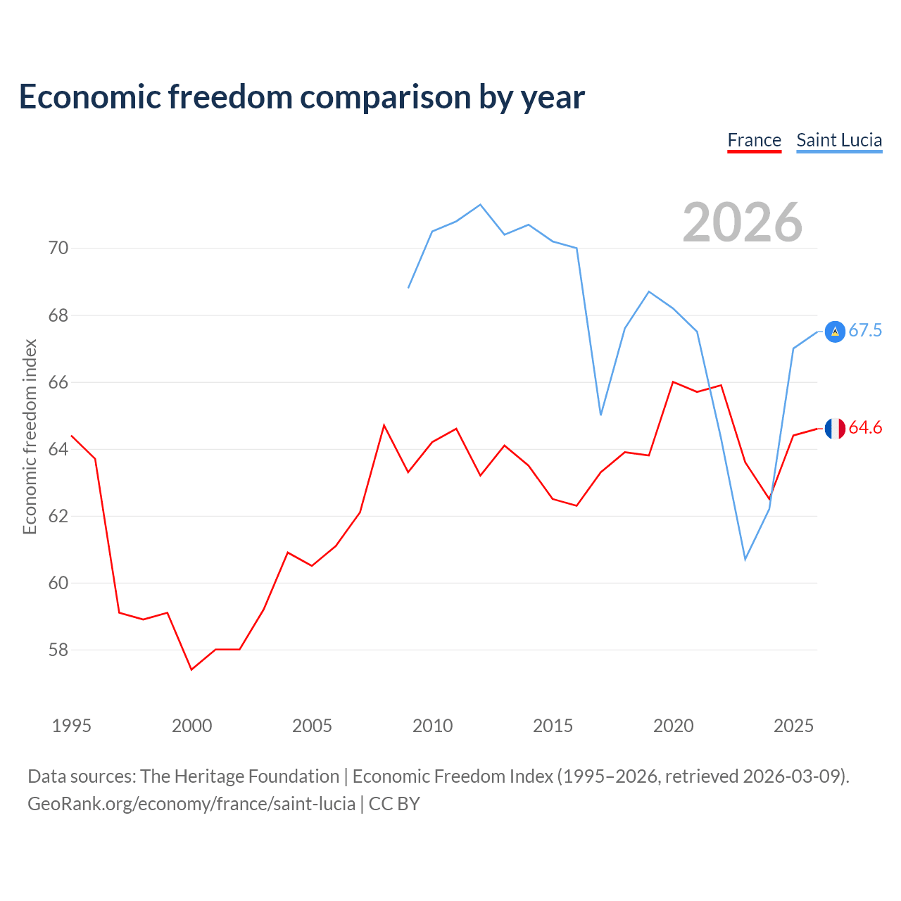The Economic Freedom Index for France is 64.6, ranking 72/197, compared to 67.5 for Saint Lucia, ranking 57/197. The chart above displays a comparison of annual changes in economic freedom indexes.
