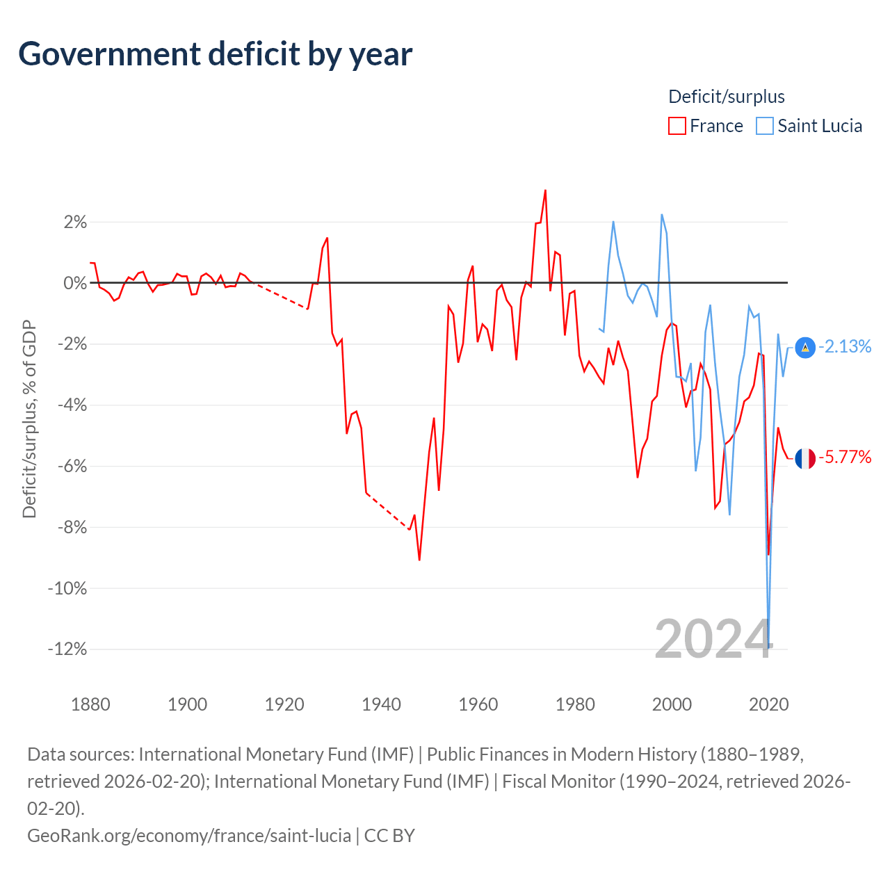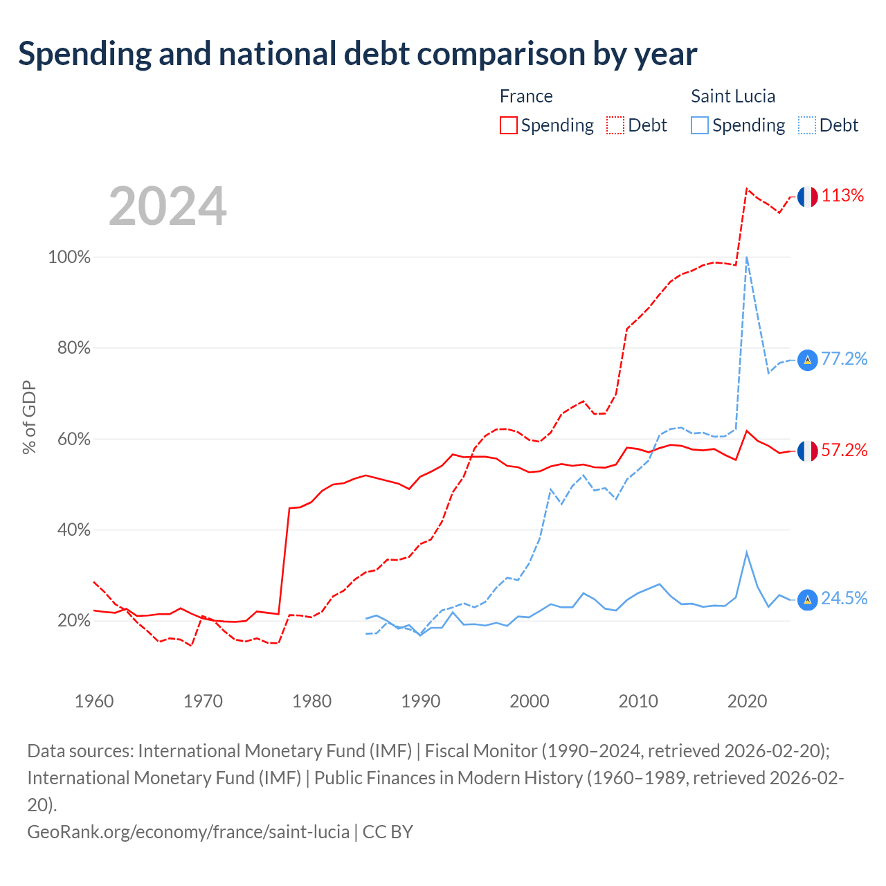 France has $3.58T in government debt (113.1% of GDP), compared to $1.97B (77.2% of GDP) in Saint Lucia.