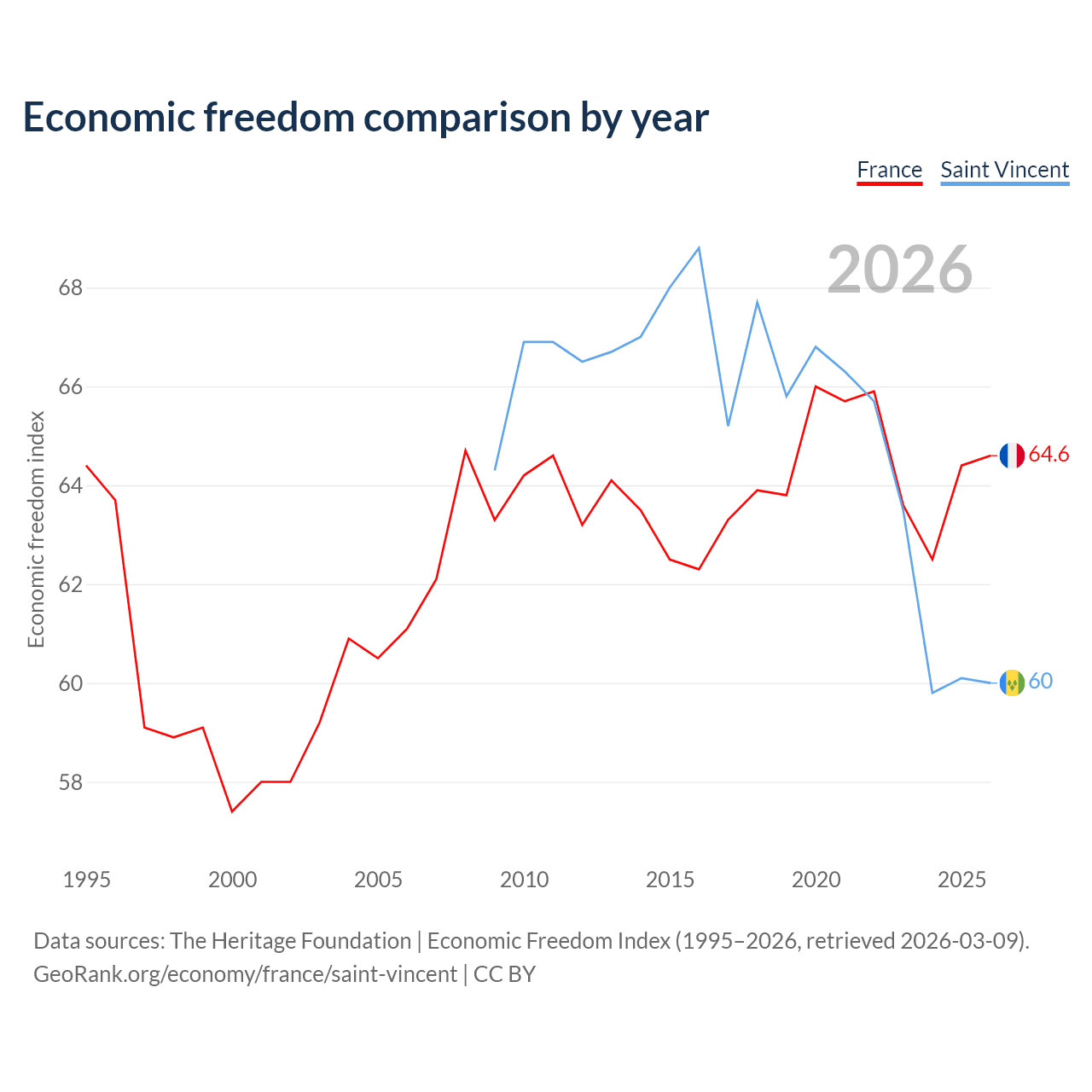 The Economic Freedom Index for France is 64.6, ranking 72/197, compared to 60 for Saint Vincent, ranking 98/197. The chart above displays a comparison of annual changes in economic freedom indexes.