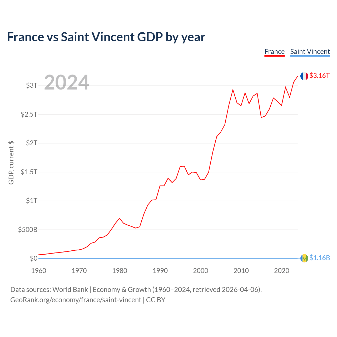 France has a GDP of $3.16T compared to $1.16B for Saint Vincent, ranking 7/197 and 186/197 by economy size, respectively.