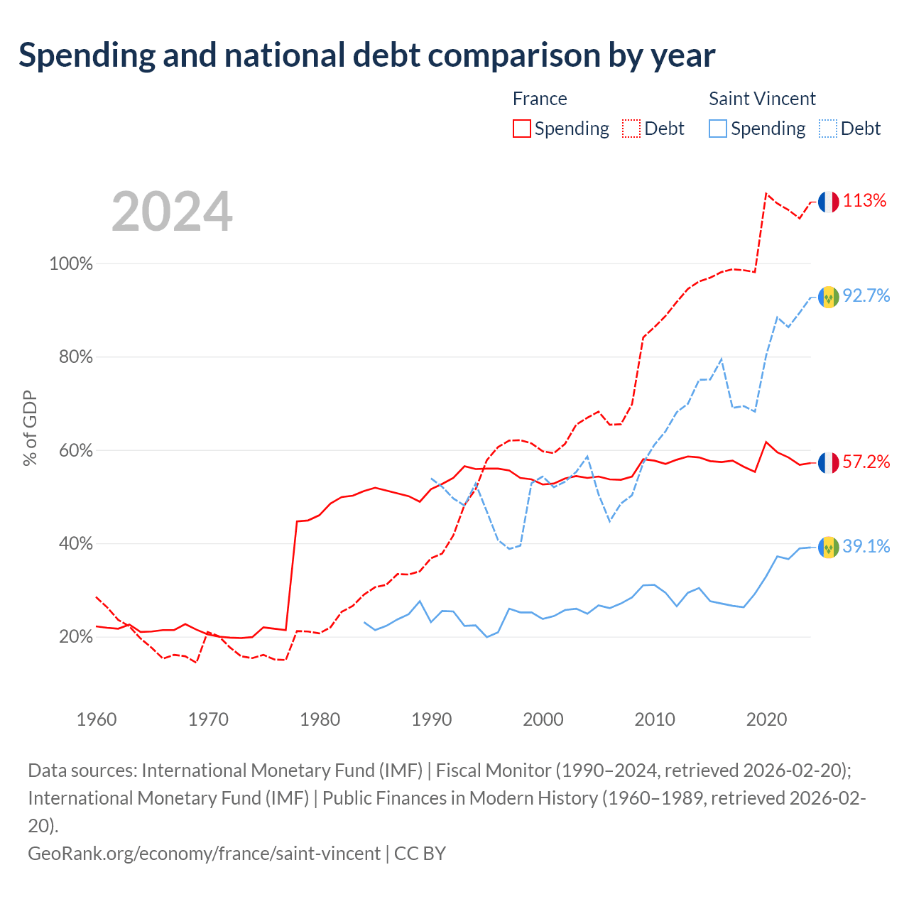 France has $3.58T in government debt (113.1% of GDP), compared to $1.07B (92.7% of GDP) in Saint Vincent.