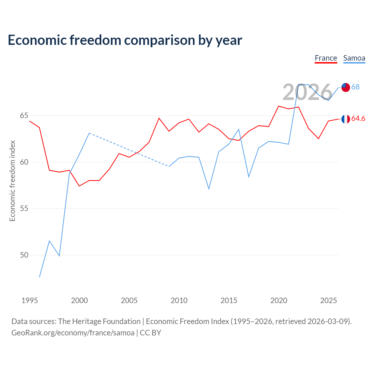 The Economic Freedom Index for France is 64.6, ranking 72/197, compared to 68 for Samoa, ranking 52/197. The chart above displays a comparison of annual changes in economic freedom indexes.