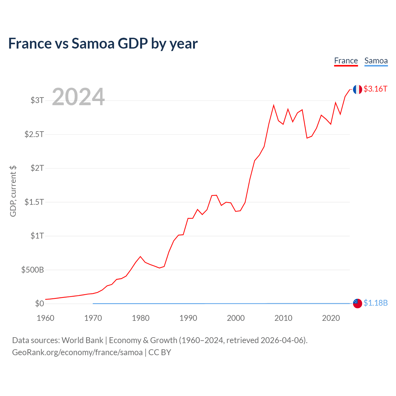 France has a GDP of $3.16T compared to $1.18B for Samoa, ranking 7/197 and 185/197 by economy size, respectively.