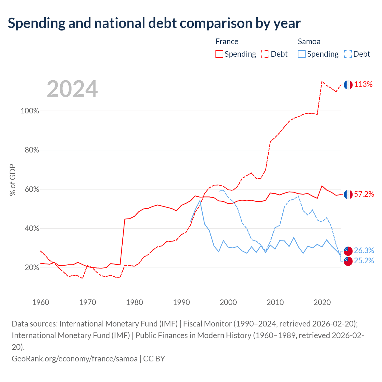 France has $3.58T in government debt (113.1% of GDP), compared to $296M (25.2% of GDP) in Samoa.