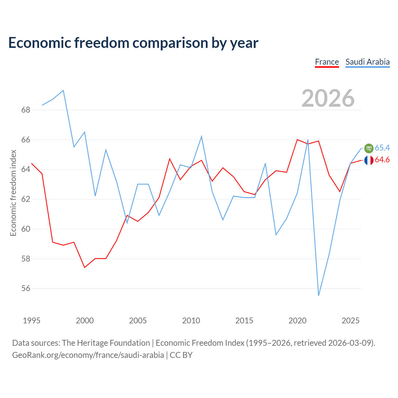 The Economic Freedom Index for France is 64.6, ranking 72/197, compared to 65.4 for Saudi Arabia, ranking 65/197. The chart above displays a comparison of annual changes in economic freedom indexes.