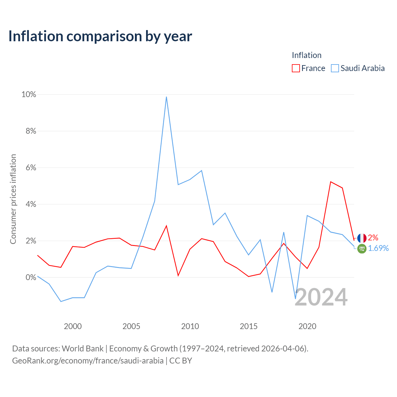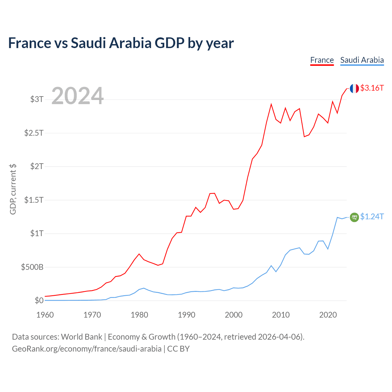 France has a GDP of $3.16T compared to $1.24T for Saudi Arabia, ranking 7/197 and 18/197 by economy size, respectively.
