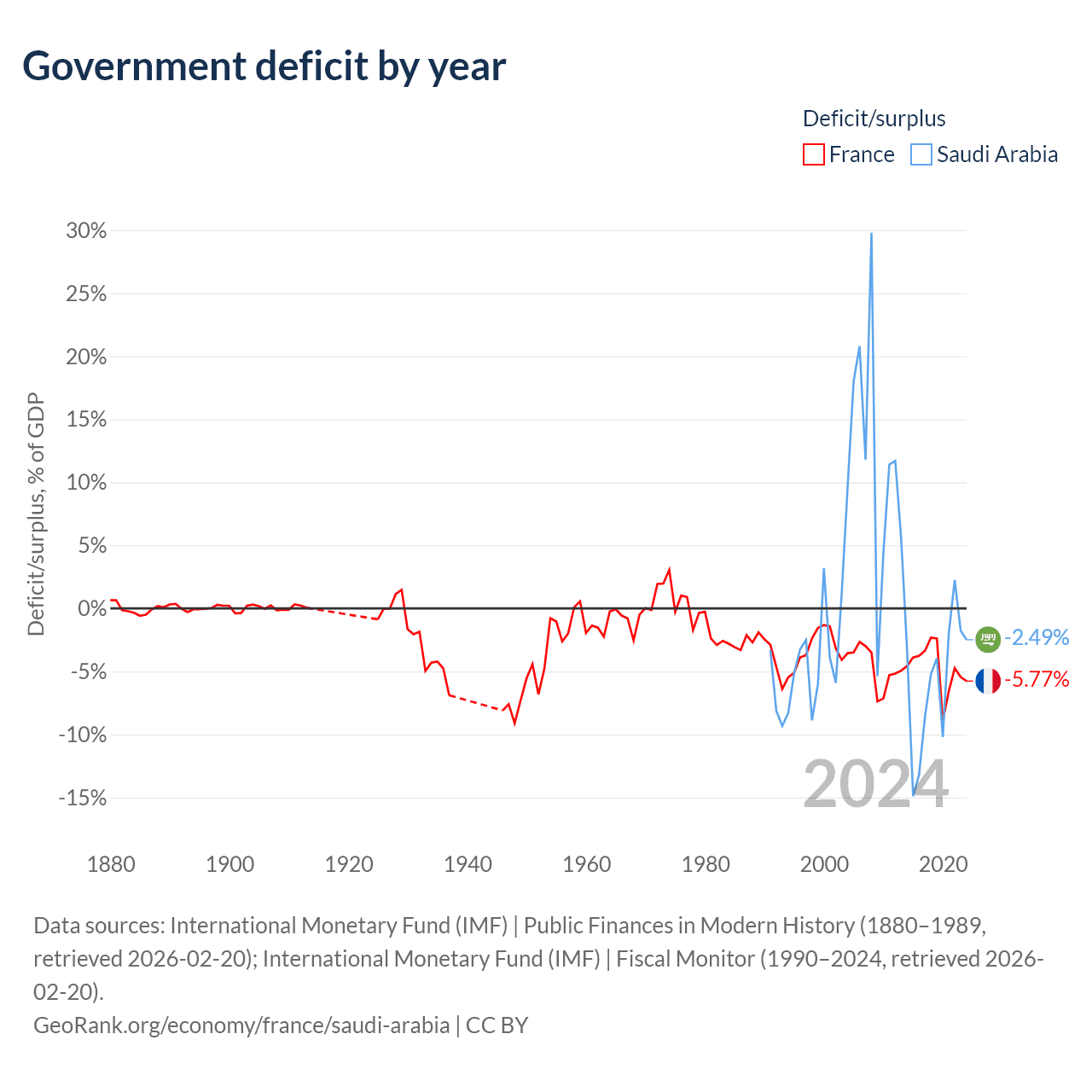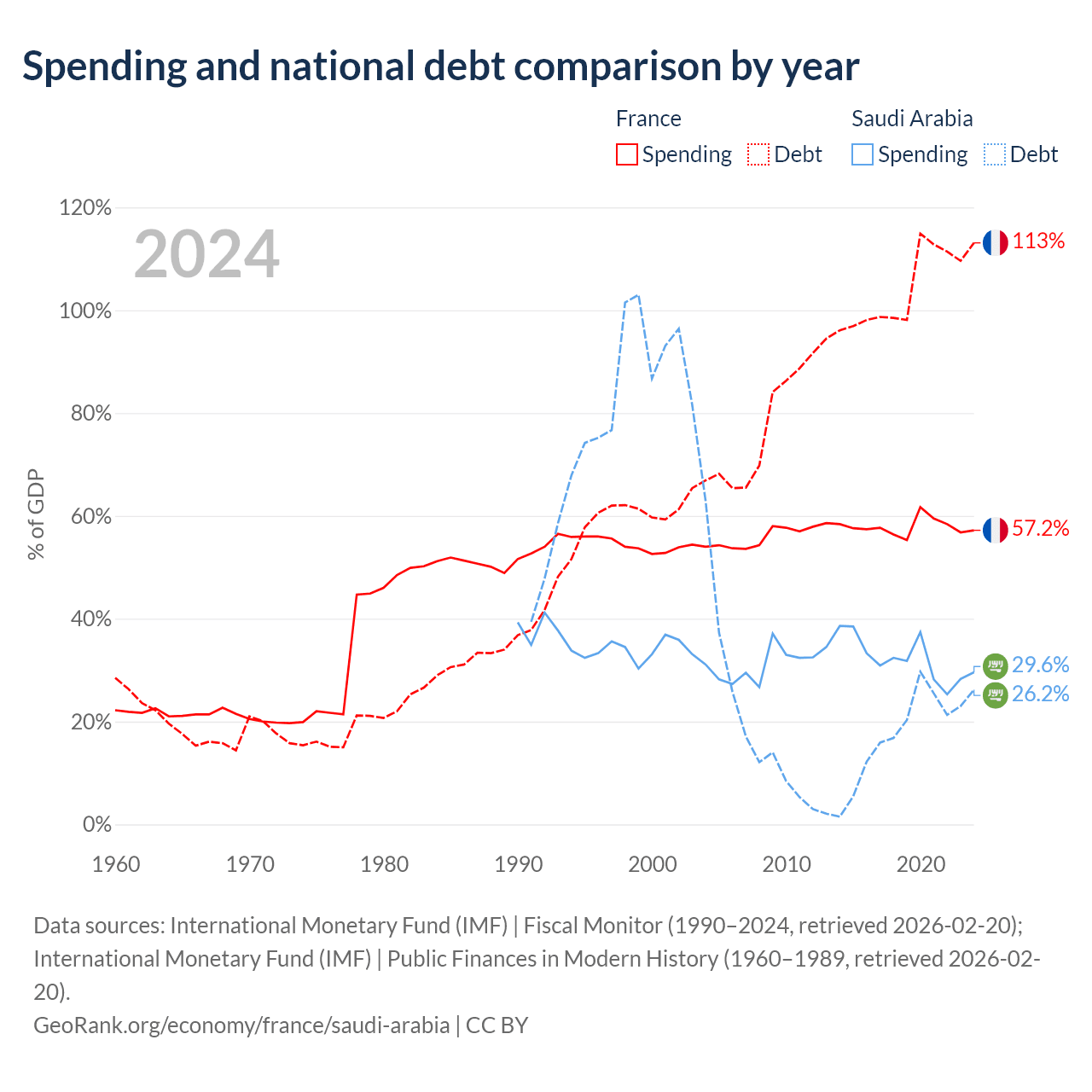 France has $3.58T in government debt (113.1% of GDP), compared to $324B (26.2% of GDP) in Saudi Arabia.