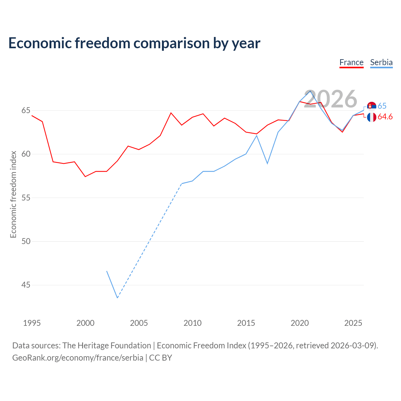 The Economic Freedom Index for France is 64.6, ranking 72/197, compared to 65 for Serbia, ranking 68/197. The chart above displays a comparison of annual changes in economic freedom indexes.