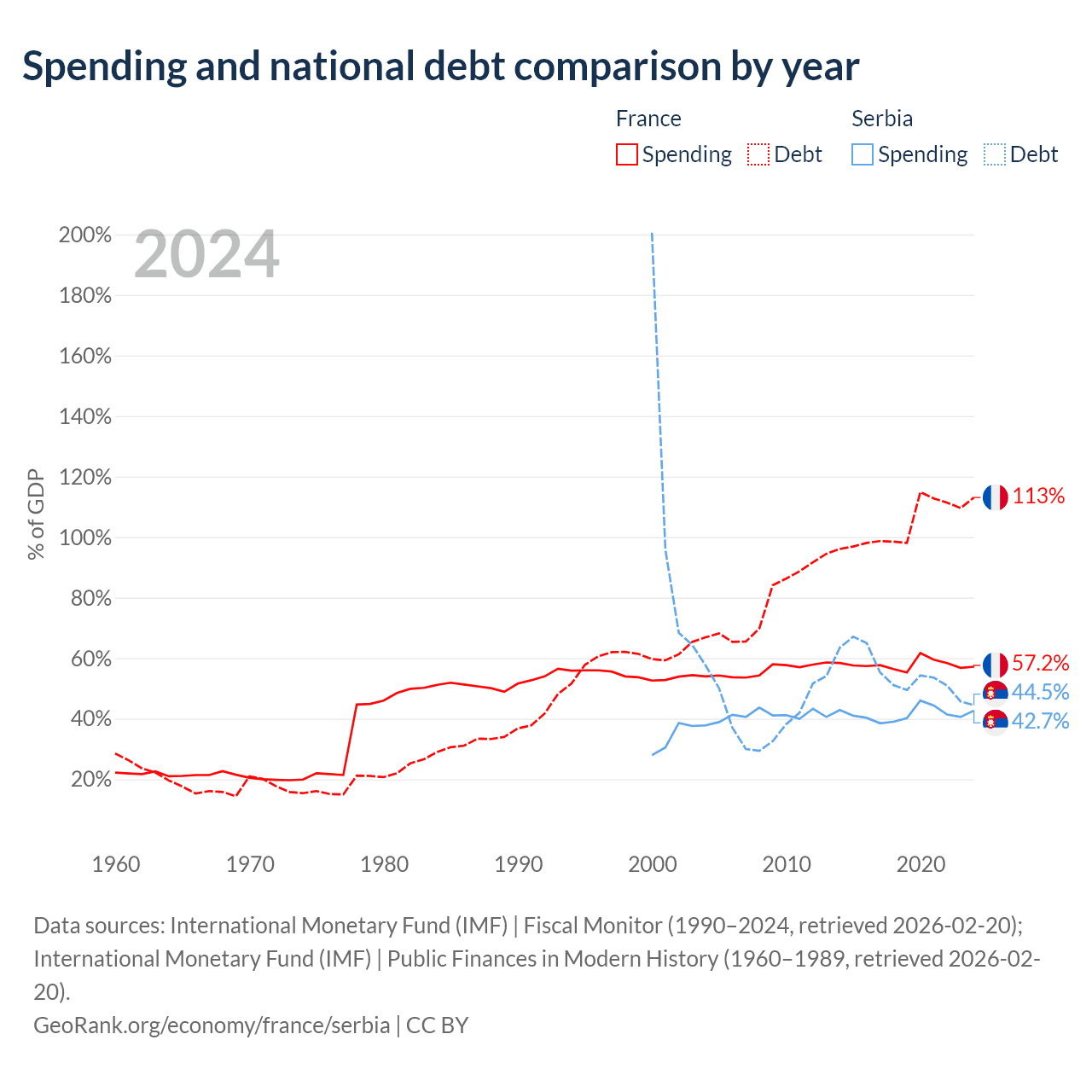 France has $3.58T in government debt (113.1% of GDP), compared to $40.1B (44.5% of GDP) in Serbia.