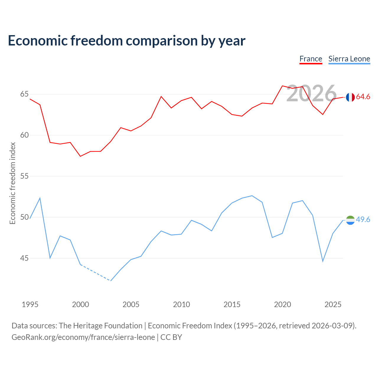 The Economic Freedom Index for France is 64.6, ranking 72/197, compared to 49.6 for Sierra Leone, ranking 165/197. The chart above displays a comparison of annual changes in economic freedom indexes.