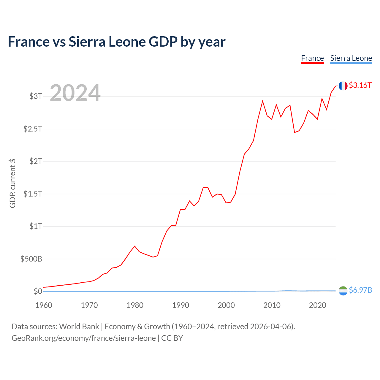 France has a GDP of $3.16T compared to $6.97B for Sierra Leone, ranking 7/197 and 160/197 by economy size, respectively.