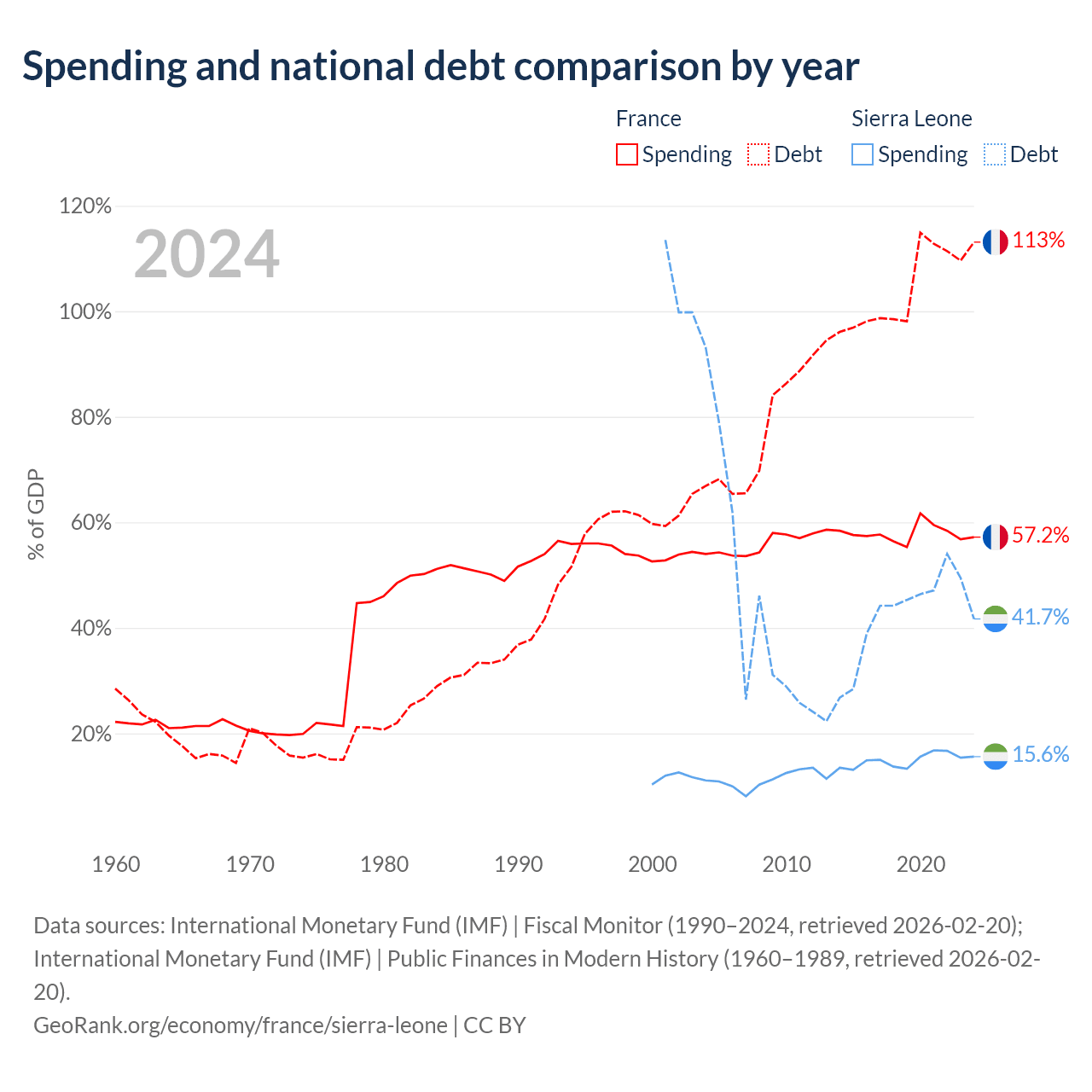 France has $3.58T in government debt (113.1% of GDP), compared to $2.91B (41.7% of GDP) in Sierra Leone.