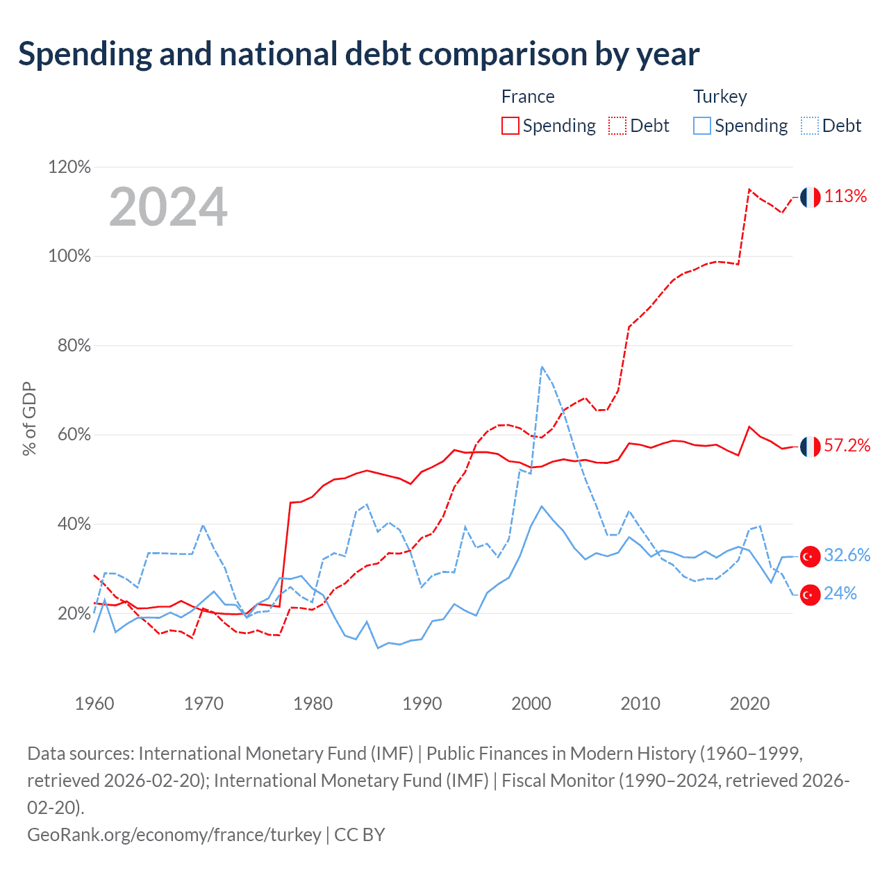 France has $3.58T in government debt (113.1% of GDP), compared to $327B (24% of GDP) in Turkey.