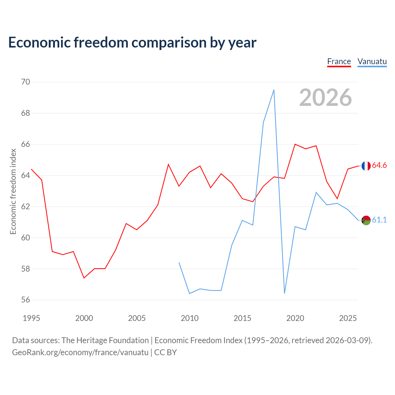 The Economic Freedom Index for France is 64.6, ranking 72/197, compared to 61.1 for Vanuatu, ranking 92/197. The chart above displays a comparison of annual changes in economic freedom indexes.