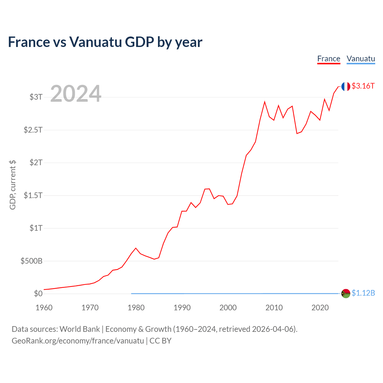 France has a GDP of $3.16T compared to $1.12B for Vanuatu, ranking 7/197 and 188/197 by economy size, respectively.