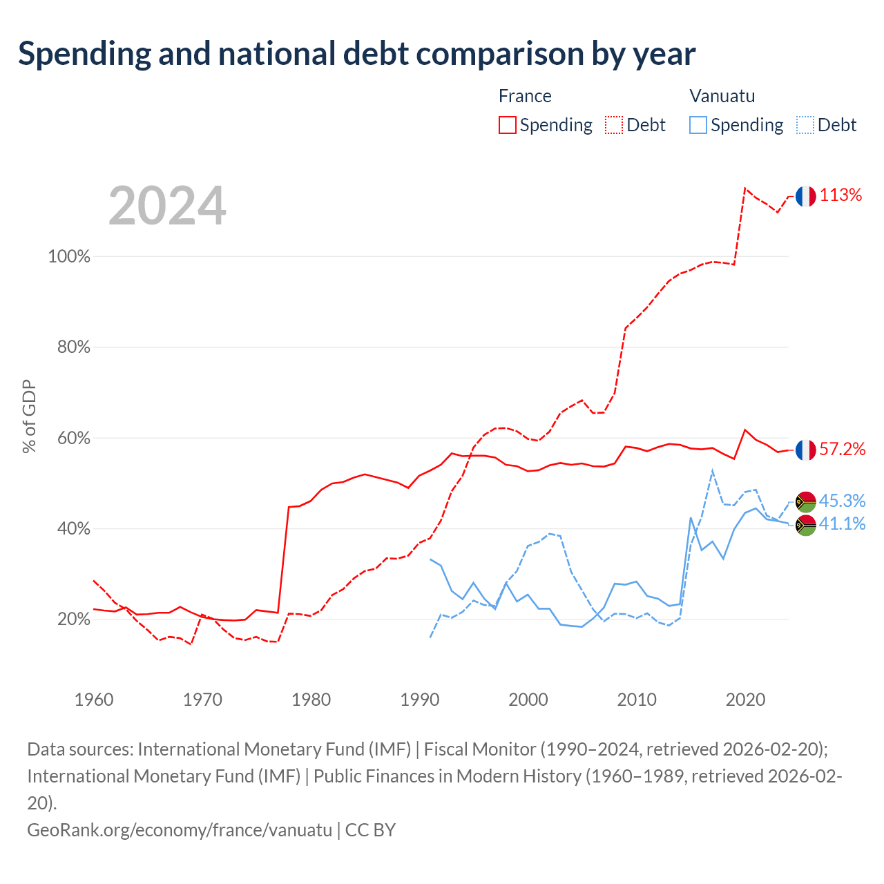 France has $3.58T in government debt (113.1% of GDP), compared to $507M (45.3% of GDP) in Vanuatu.