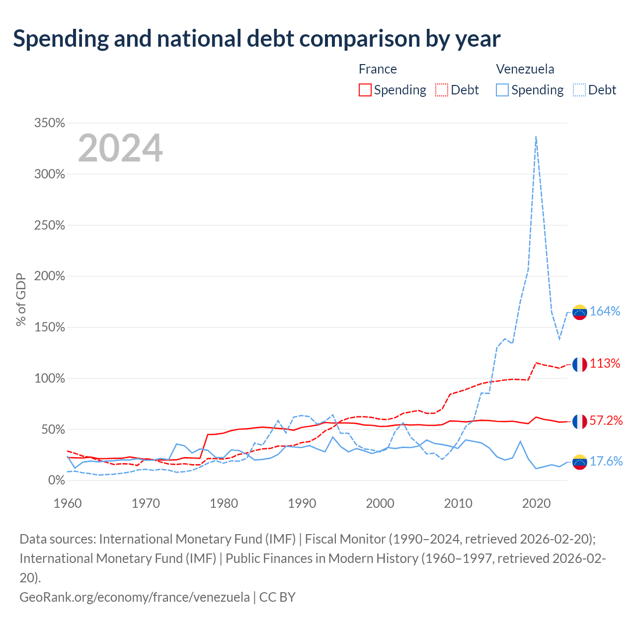 France has $3.58T in government debt (113.1% of GDP), compared to $197B (164.3% of GDP) in Venezuela.