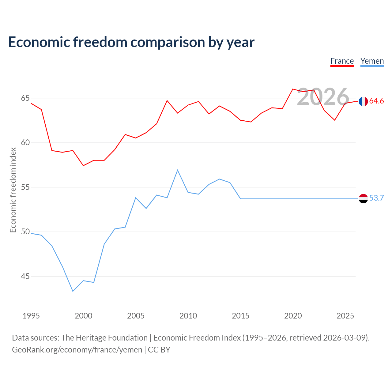 The Economic Freedom Index for France is 64.6, ranking 72/197, compared to 53.7 for Yemen, ranking 138/197. The chart above displays a comparison of annual changes in economic freedom indexes.