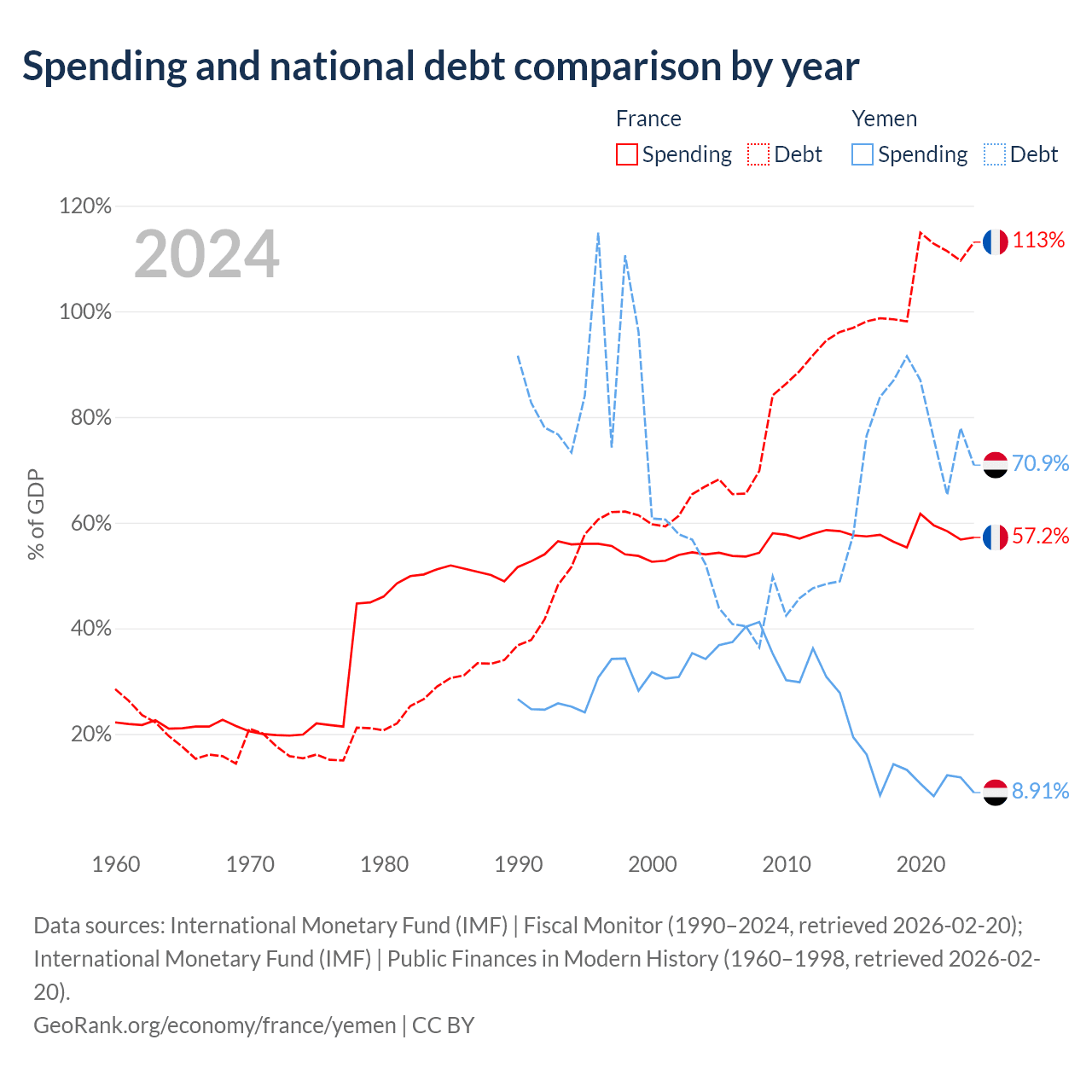 France has $3.58T in government debt (113.1% of GDP), compared to $18.8B (70.9% of GDP) in Yemen.