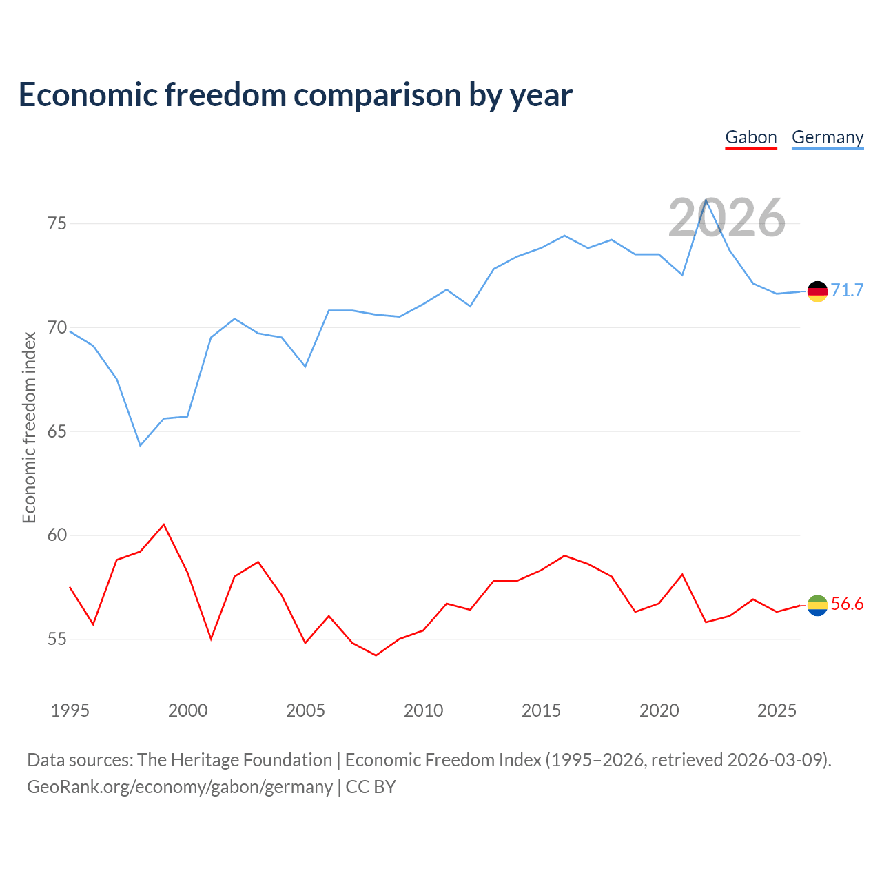 The Economic Freedom Index for Gabon is 56.6, ranking 120/197, compared to 71.7 for Germany, ranking 30/197. The chart above displays a comparison of annual changes in economic freedom indexes.