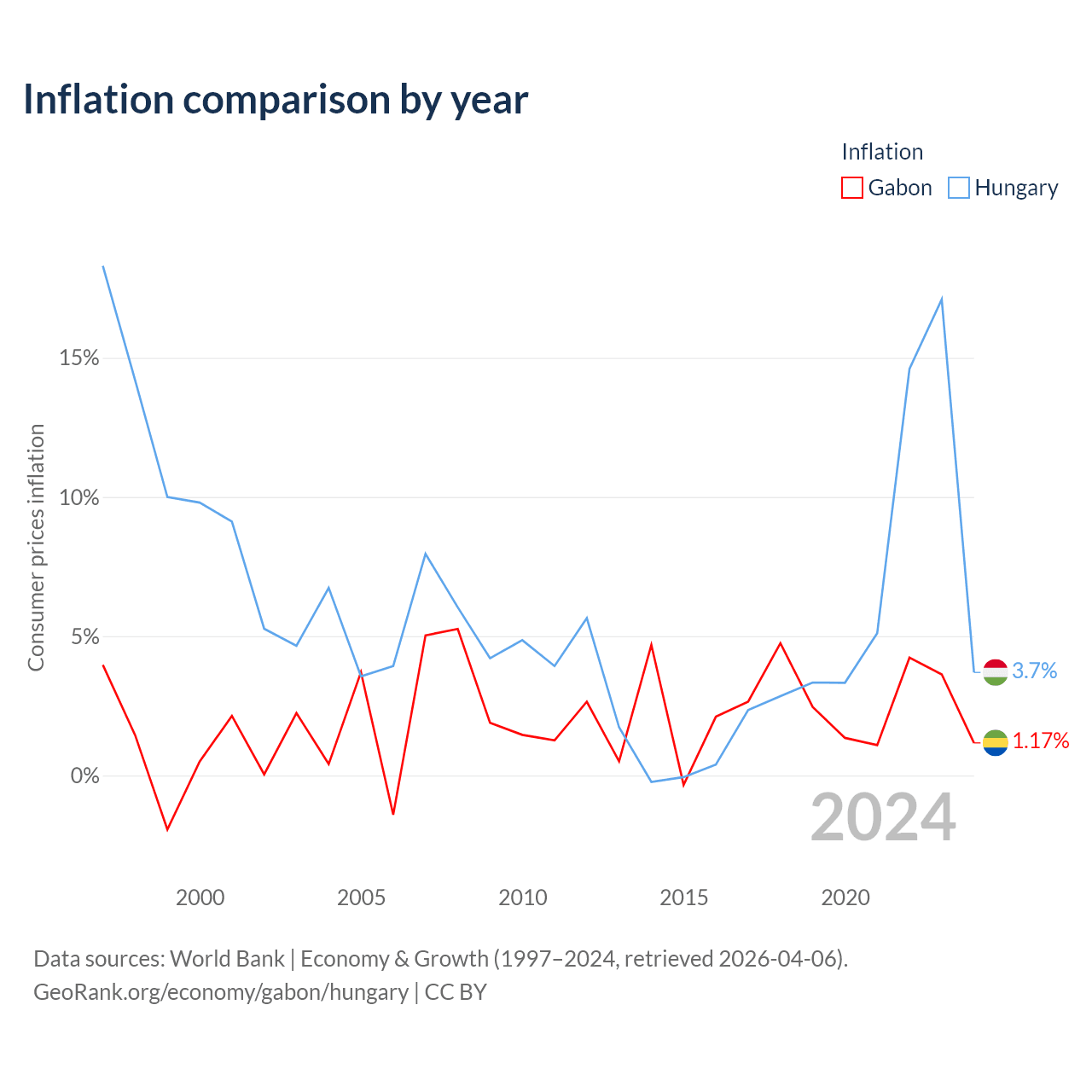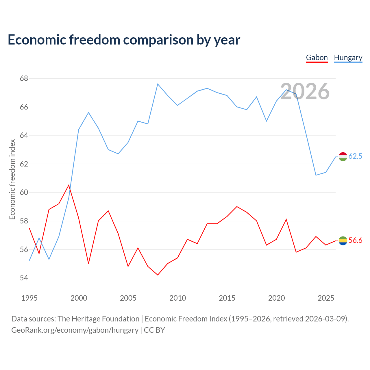 The Economic Freedom Index for Gabon is 56.6, ranking 120/197, compared to 62.5 for Hungary, ranking 86/197. The chart above displays a comparison of annual changes in economic freedom indexes.