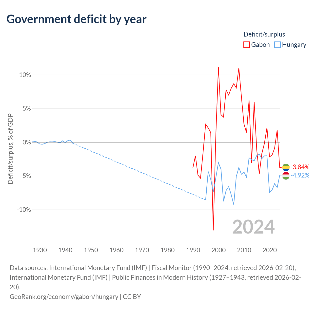 Gabon has a GDP of $20.9B compared to $223B for Hungary, ranking 127/197 and 55/197 by economy size, respectively.