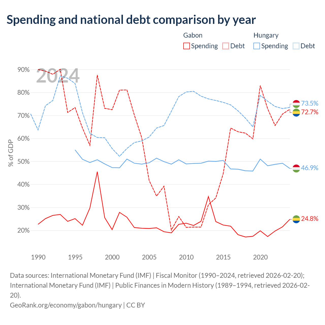 Gabon has $15.2B in government debt (72.7% of GDP), compared to $164B (73.5% of GDP) in Hungary.
