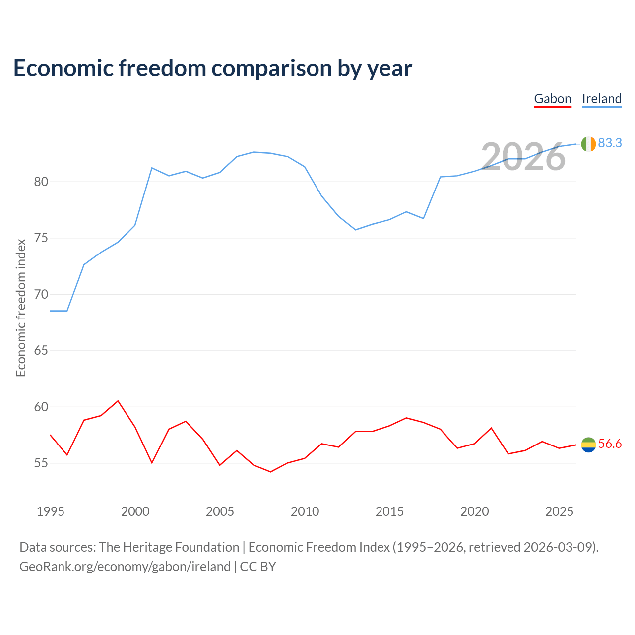 The Economic Freedom Index for Gabon is 56.6, ranking 120/197, compared to 83.3 for Ireland, ranking 3/197. The chart above displays a comparison of annual changes in economic freedom indexes.