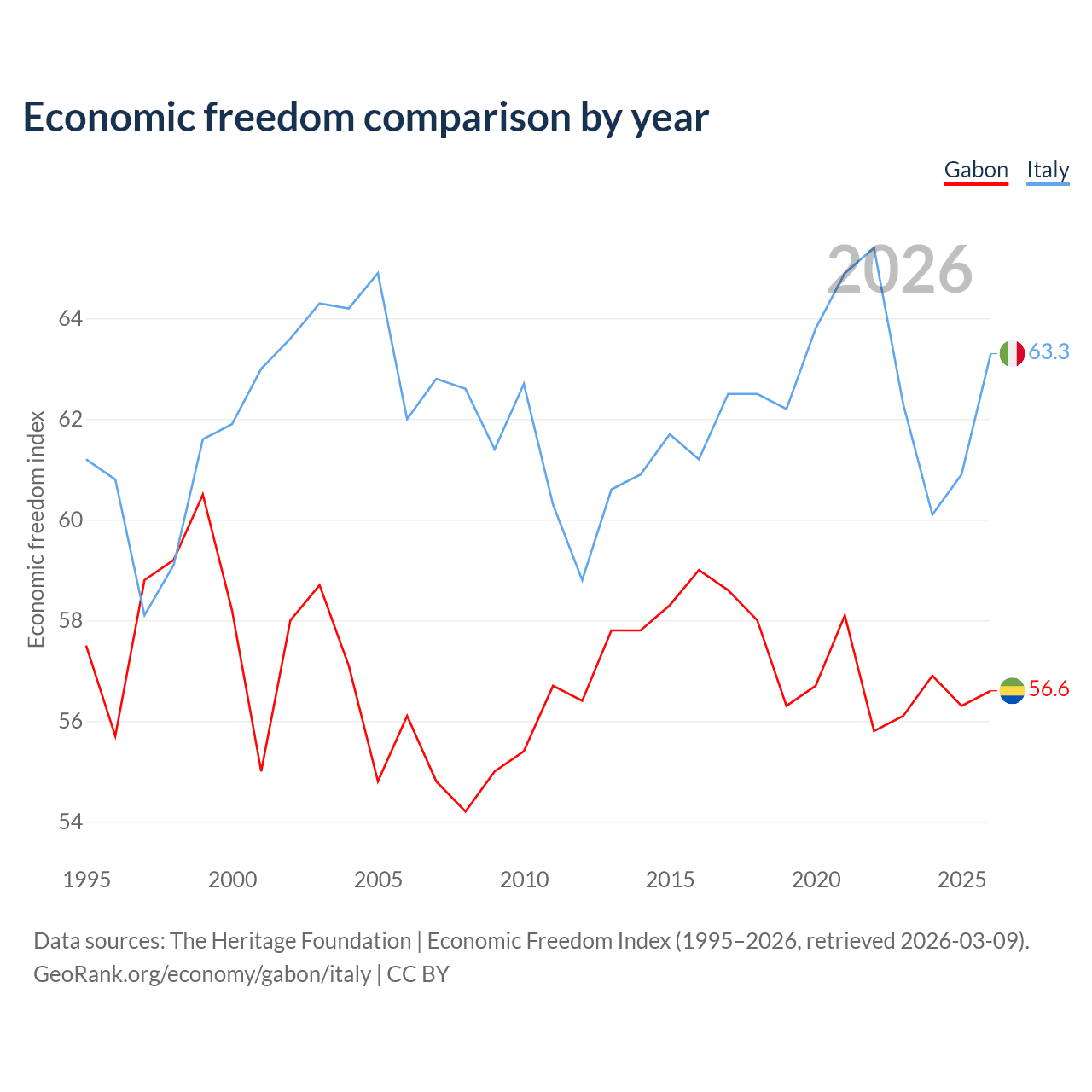 The Economic Freedom Index for Gabon is 56.6, ranking 120/197, compared to 63.3 for Italy, ranking 80/197. The chart above displays a comparison of annual changes in economic freedom indexes.