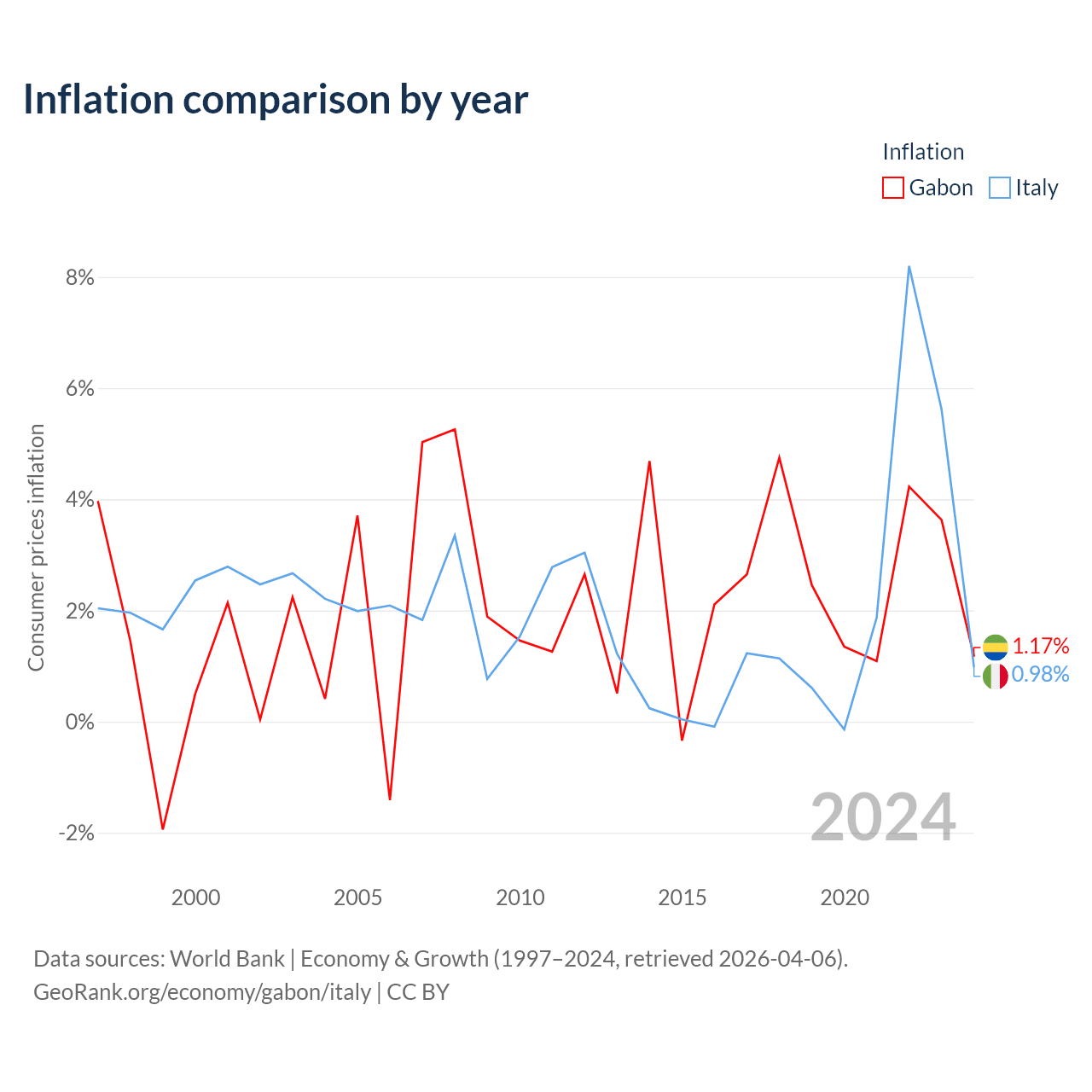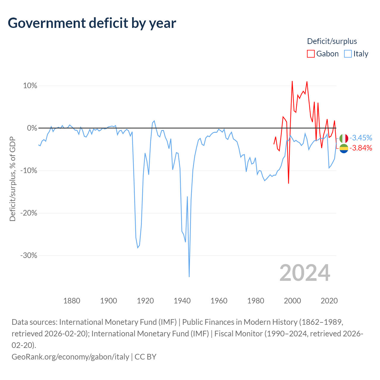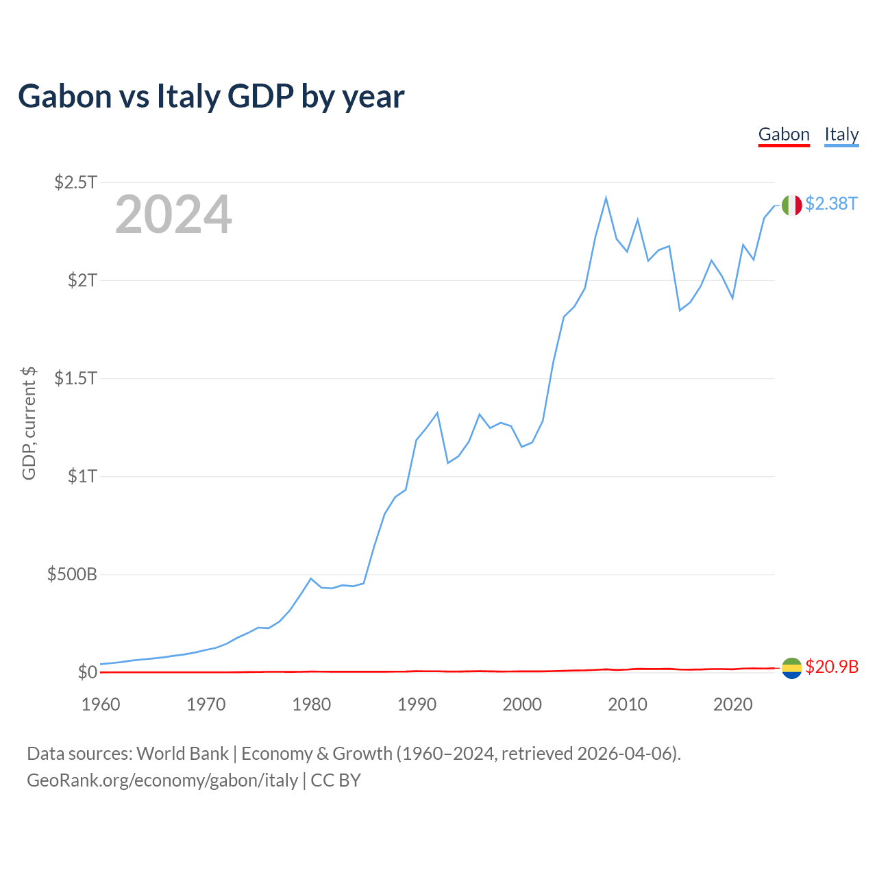 Gabon has a GDP of $20.9B compared to $2.38T for Italy, ranking 127/197 and 8/197 by economy size, respectively.