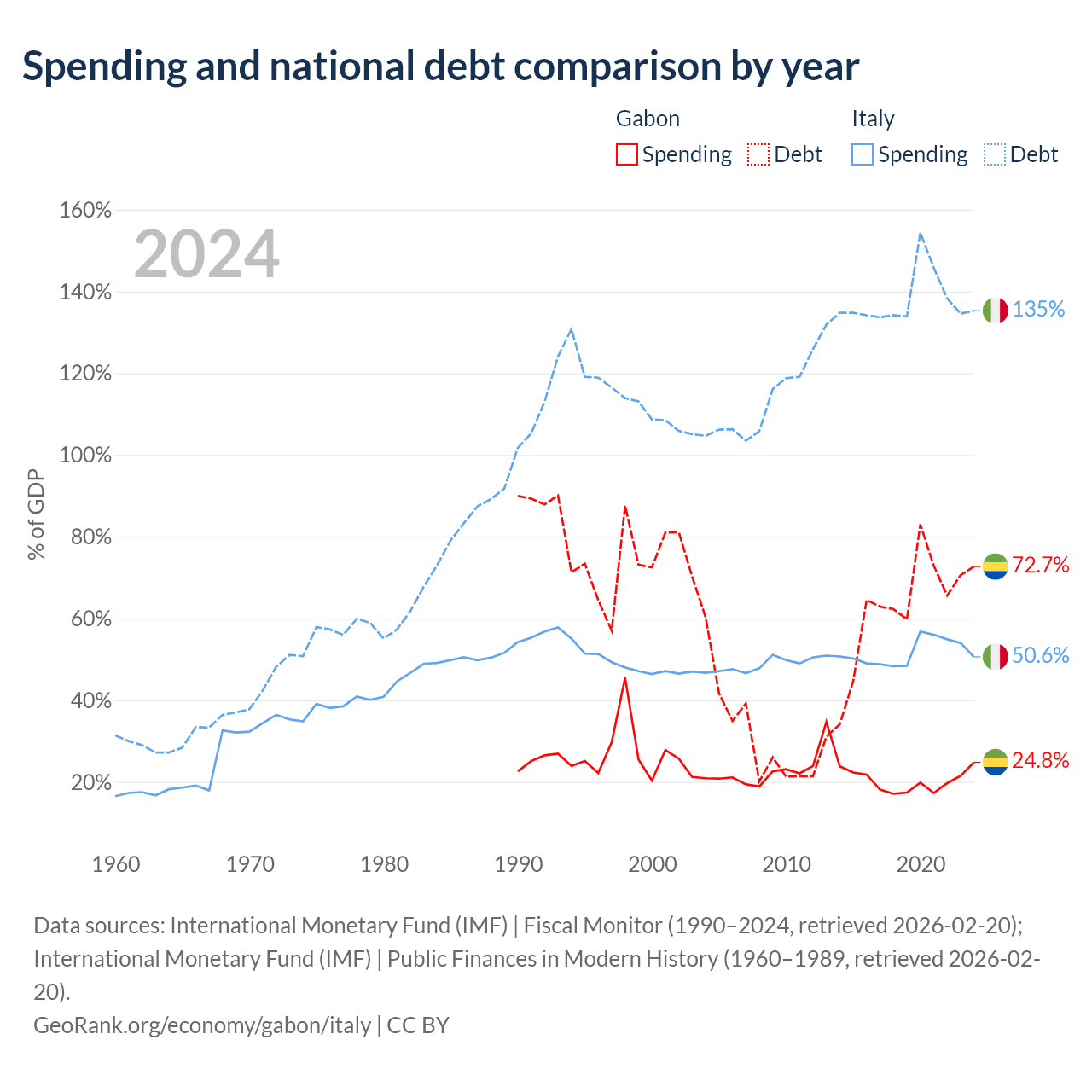 Gabon has $15.2B in government debt (72.7% of GDP), compared to $3.22T (135.3% of GDP) in Italy.