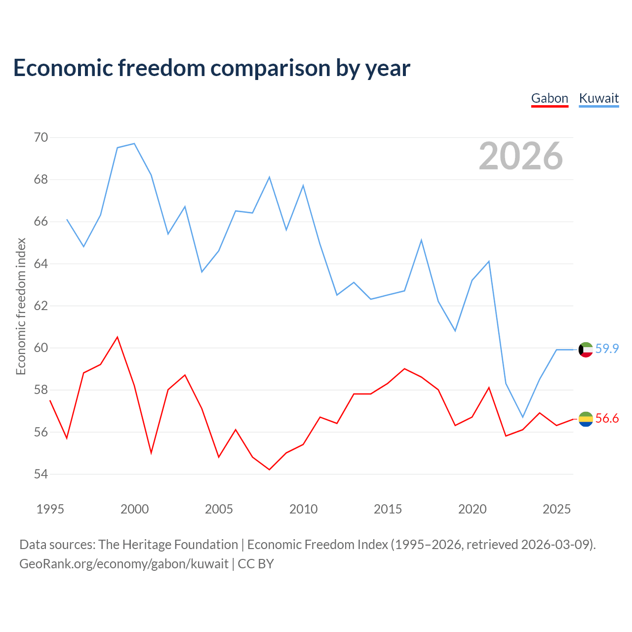 The Economic Freedom Index for Gabon is 56.6, ranking 120/197, compared to 59.9 for Kuwait, ranking 100/197. The chart above displays a comparison of annual changes in economic freedom indexes.