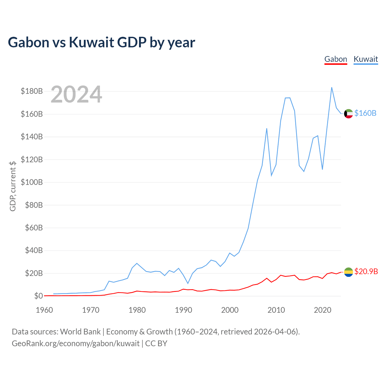 Gabon has a GDP of $20.9B compared to $160B for Kuwait, ranking 127/197 and 59/197 by economy size, respectively.