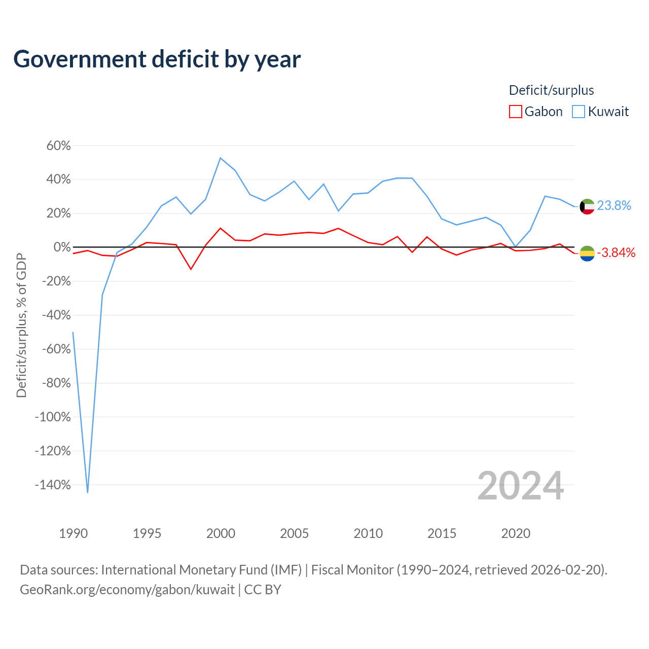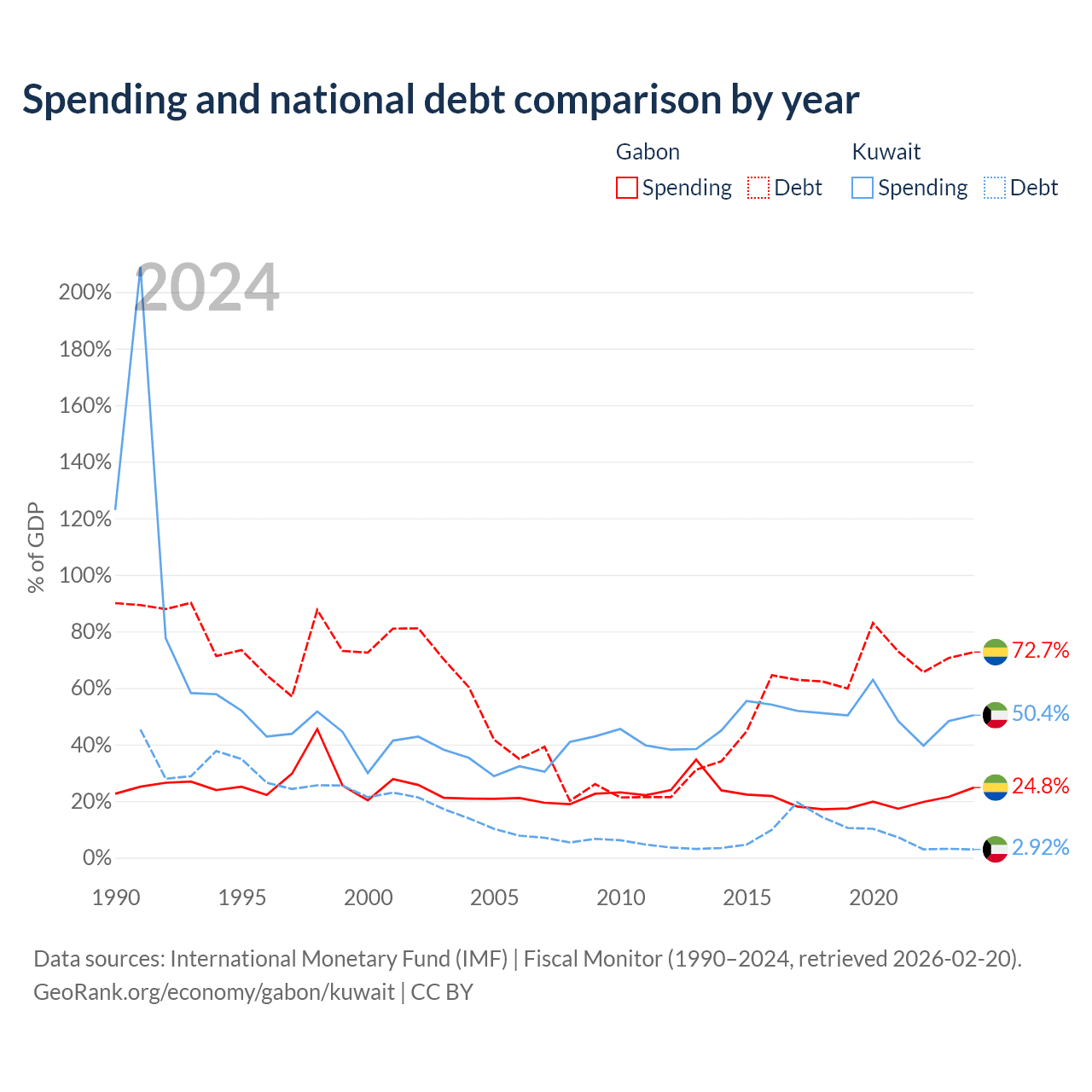 Gabon has $15.2B in government debt (72.7% of GDP), compared to $4.68B (2.92% of GDP) in Kuwait.
